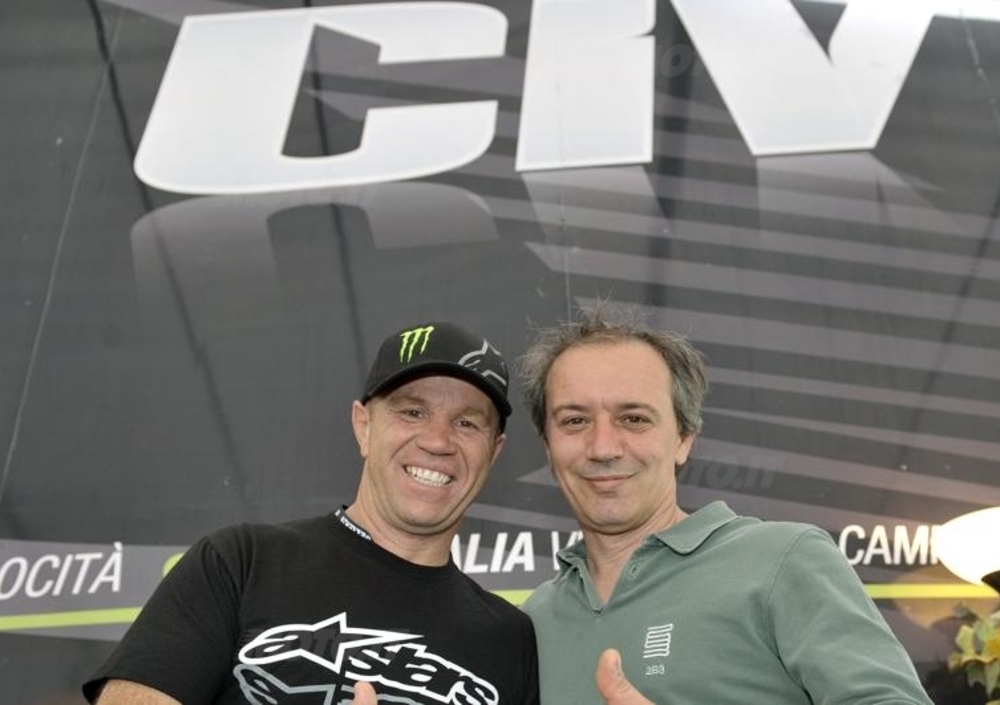 Il 48enne modenese, entrato l’anno scorso nella Hall of Fame del CIV per aver vinto in carriera quattro titoli italiani, ha raggiunto il “circus tricolore” per incontrare il suo amico Randy Mamola: quattro volte vice-campione del mondo della 500 tra il 1980 e il 1987 in sella a Suzuki, Honda e Yamaha, il 53enne californiano segue quest’anno il figlio Dakota, al debutto nel CIV nella categorie Stock 600 dedicata ai giovani.