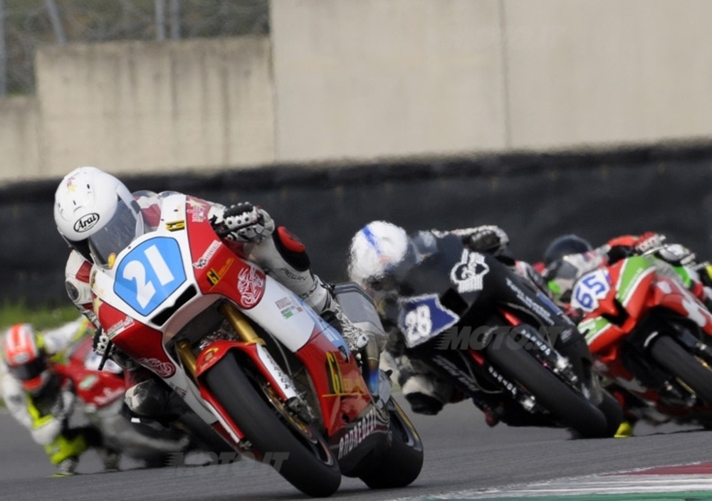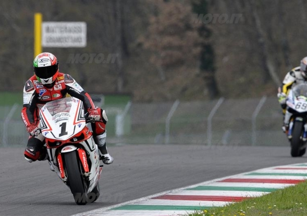 Aveva già dimostrato in prova di avere una marcia in più rispetto agli avversari e Alessio Corradi è riuscito a chiudere uno splendido week-end con la ciliegina sulla torta, la vittoria. Scattato forte dalla pole position il “folletto” di Langhirano (Aprilia – Team Nuova M2) ha preso subito il largo con una serie di giri veloci che gli hanno permesso di staccare gli avversari. L’unico a tenergli testa, grazie ad un ottimo recupero, è stato l’umbro Alessio Velini (BMW – 2R Antonellini by Bargy) che dopo una partenza così così si è rifatto sotto al parmense nelle fasi finali, senza però colmare quei cinque decimi di gap che gli avrebbero permesso di battersi con Corradi fino all’ultimo metro. Una prestazione comunque positiva per Velini, che si è messo alle spalle un concreto Ivan Goi: il mantovano, ex-campione italiano della Stock 1000, ha portato sul podio all’esordio la Ducati 1199 Panigale dimostrando di avere già un ottimo feeling con la moto preparata dal Team Barni.