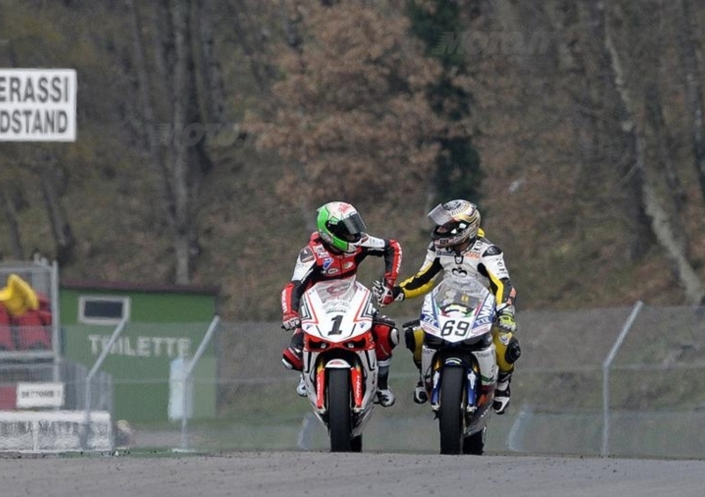 Passato sul rettilineo per il giro finale con due secondi da recuperare, il toscano del Team Grandi Corse ha corso gli ultimi metri con il “coltello tra i denti”, presentandosi alla curva finale alle spalle del campione. Alla fine l’ha spuntata lo stesso Baiocco, alfiere Ducati Barni, autore della prima vittoria al cardiopalmo del 2012. Bravo, Matteo, a sfruttare al meglio il potenziale suo e della 1198 targata Barni e a confermarsi al vertice della categoria. Nannelli, dal canto suo, ha mandato un segnale a Baiocco, che non potrà rilassarsi neanche un secondo quest’anno. In terza piazza ha chiuso Fabrizio Lai. Il milanese, alfiere Ducati Althea Racing by Echos si è liberato in fretta di un Luca Conforti ancora alle prese con il feeling con le Pirelli (il lombardo del Team Barni chiuderà quarto sotto la bandiera a scacchi) ma non è riuscito a tenere il ritmo dei primi due anche a causa di un braccio piuttosto dolorante.