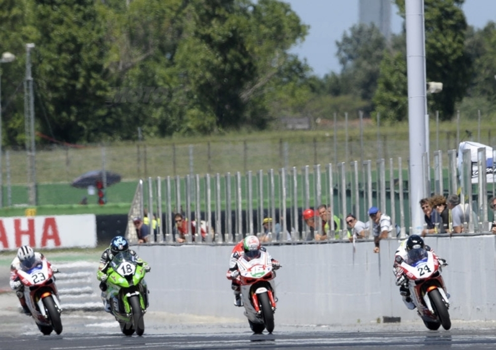 E’ stata una gara di livello mondiale. Una Kawasaki verde, una Honda rossa e una Yamaha azzurra hanno dato vita ad un grande spettacolo fino all’ultima curva. La R6 del Bike Service era guidata dal campione in carica, il romagnolo Roberto Tamburini, che grazie agli ultimi tre giri da cardiopalmo è riuscito ad avere la meglio sulla Kawasaki del corregionale e wild-card, Massimo Roccoli e sulla CBR della Scuderia Improve guidata dal leader della classifica, il laziale Ilario Dionisi. Tamburini ha vinto con un sorpasso da manuale alla curva “Misano” proprio su Roccoli, conquistando la prima vittoria della stagione.
