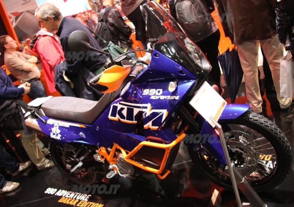A Milano esordisce la Dakar Edition della 990 Adventure, carattarizzata da una brillante colorazione blu che contrasta con effetto col telaio arancione e la barra di protezione nello stesso colore.