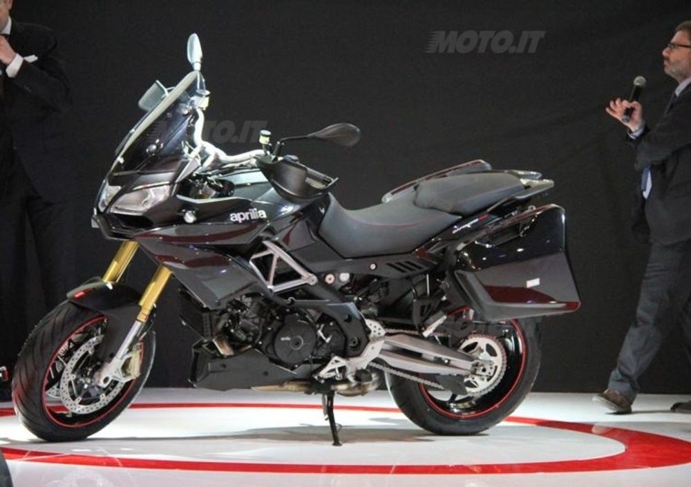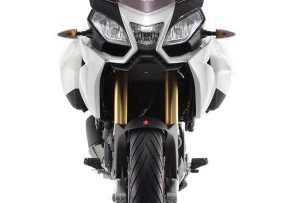 Lo scarico basso già adottato sulla RSV4 consente di integrare facilmente le valige laterali (da 29 litri, in tinta con la carrozzeria) grazie anche alla sua regolabilità in altezza. L’impianto frenante è affidato a Brembo, che fornisce dischi flottanti in acciaio di 320 mm e pinze monoblocco a 4 pistoncini e attacco radiale all’avantreno nonché un disco singolo da 240mm al retrotreno, tutti gestiti dall’ABS a due canali di serie.