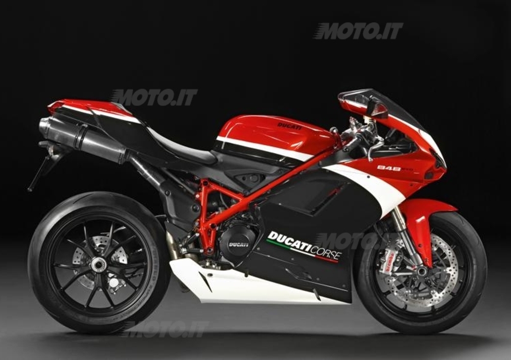 La 848EVO MY2012 mantiene la tradizionale colorazione rosso Ducati, con telaio rosso e ruote nere, il bianco white artic con telaio e cerchi in rosso e la versione “dark stealth”, con telaio nero racing e ruote nere.