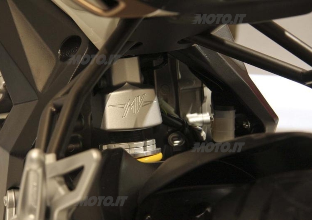 Un motore stretto, ma anche corto grazie a una disposizione degli organi interni del tutto particolare. Con un alesaggio di 79 mm e una corsa di 45,9 mm, il tre cilindri MV Agusta è un propulsore fortemente superquadro capace di raggiungere regimi elevati.