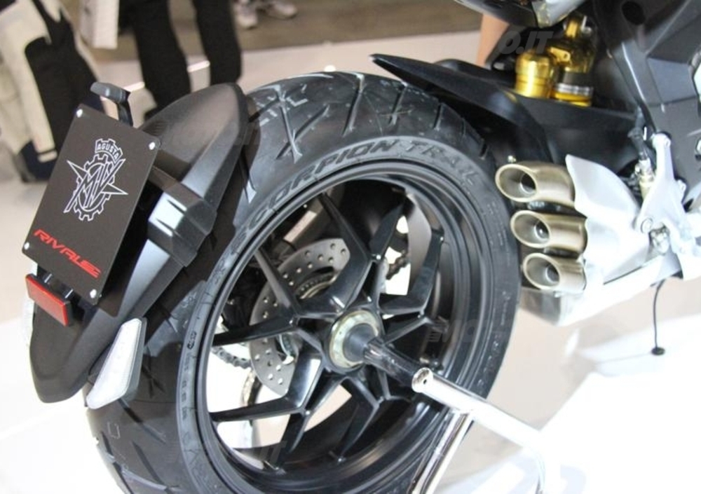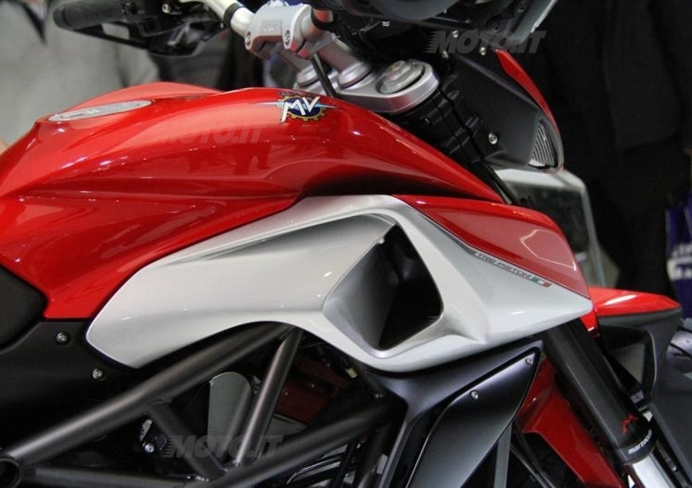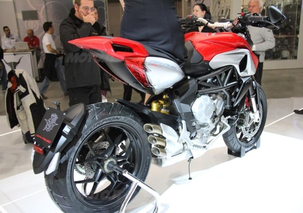MV Agusta, Rivale 800 entra in un nuovo segmento di mercato. 170 kg, per 125 cv. Estende la gamma con una nuova, interpretazione del modernissimo motore tre cilindri che ha debuttato sulla F3 675 e che equipaggia anche Brutale 675 e 800, affiancando le rinnovate famiglie a quattro cilindri F4 e Brutale. Il cupolino è compatto, sfuggente ma capace di caratterizzare un avantreno dalla personalità esuberante. La sezione centrale è snella, disegnata per favorire la guida sportiva e permettere al pilota la massima libertà di movimento sulla sella ampia ed ergonomica. Il codino è elegante, e caratterizzato da gruppi ottici dal look estremamente originale. La tecnologia LED è largamente impiegata: all'avantreno, sia per delimitare le estremità del manubrio, aumentando la visibilità della moto da ogni angolo d'osservazione e quindi la sicurezza passiva, sia per gli indicatori di direzione, dall’originale color ambra, integrati nei paramani; dietro, luci di posizione e di stop sono ospitati in due elementi separati, mentre gli indicatori di direzione sono stati collocati sul piccolo parafango, a cui è vincolata anche la targa. Gli specchi retrovisori sono retraibili, per la guida sportiva su strade chiuse al traffico o in pista, ma anche telescopici, per migliorare la visione posteriore. Il cruscotto è stato progettato appositamente per Rivale 800: interamente digitale, multifunzione, è compatto per trovare posto sul ponte di comando, ma allo stesso tempo offre la massima disponibilità di informazioni.