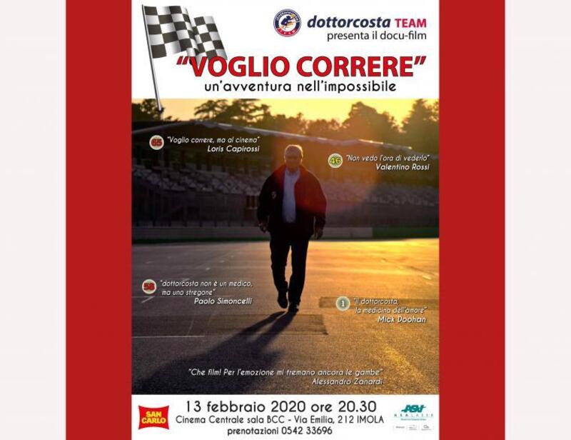 Due ore sulle ginocchia di un nonno che racconta una storia, davanti a un caminetto che scalda e proietta variazioni di luce. Solo che le ginocchia sono state le poltroncine di un cinema sopravvissuto alla modernità, il Centrale di Imola, e il fuoco lo schermo su cui andava in scena la prima del mini tour di “Voglio correre”, il film voluto e realizzato da Claudio Marcello Costa per raccontare la sua vita tra i piloti. Un nonno, il Dottorcosta, che ricorre all’epica, alla letteratura, al linguaggio di fiaba e che potrebbe talvolta correre il rischio, proprio per questo suo modo, di non risultare abbastanza credibile.