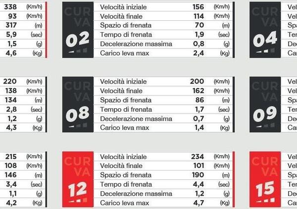 Al Mugello complessivamente i piloti usano i freni nove volte al giro, per un totale di 29 secondi, valore che corrisponde al 28% della durata complessiva della gara.