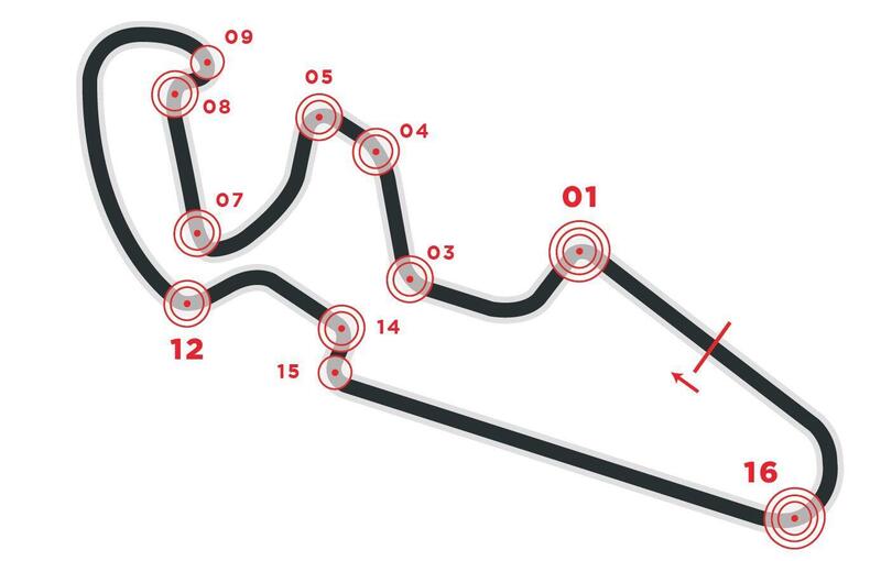 La staccata più complessa è quella all’ultima curva (la numero 16). Le MotoGP perdono 191 km/h passando da 336 km/h a 145 km/h in 4,7”, durante i quali percorrono 273 metri. I piloti sono soggetti a 1,5 g di decelerazione mentre la pressione del liquido freno raggiunge i 12,3 bar per via di un carico sulla leva di 5,7 kg.