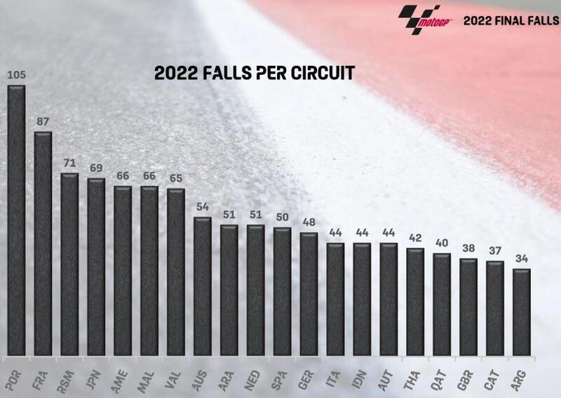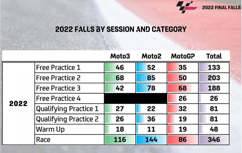 Nel complesso, sommando tutte e tre le classi nella stagione 2022, ben 346 cadute sono avvenute nel corso della gara, come in fondo è naturale che sia.