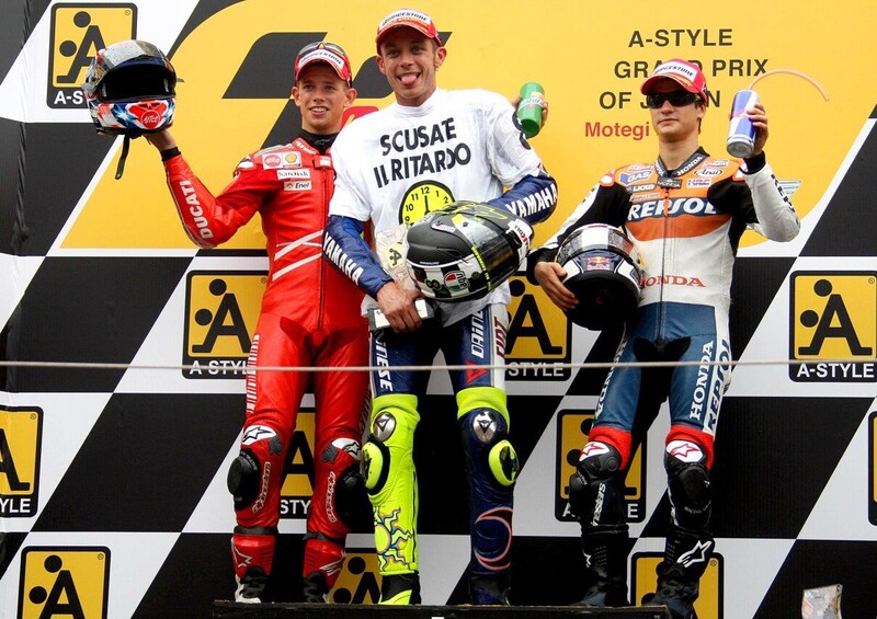 Dopo un anno piuttosto complicato, Valentino Rossi torna al massimo livello nel 2008 e a Motegi arriva l’ottavo titolo mondiale, (quarto in MotoGP), con Valentino primo anche al traguardo: non sono tanti i piloti che festeggiano il titolo con una vittoria, impresa riuscita a Rossi sette volte su nove…