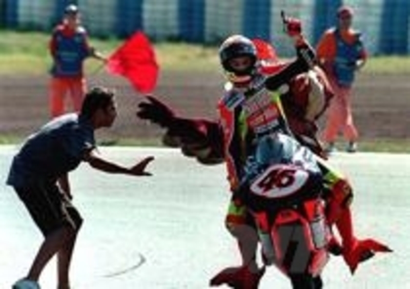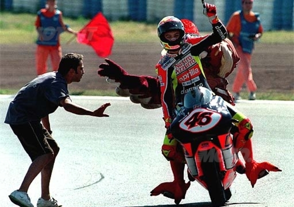 2001: Rossi e Biaggi sono i principali candidati al titolo della 500 e la tensione tra i due è altissima. Valentino vince davanti a Max e a Capirossi, ma prima di salire sul podio i due grandi rivali arrivano quasi alle mani, prima di essere separati a fatica.