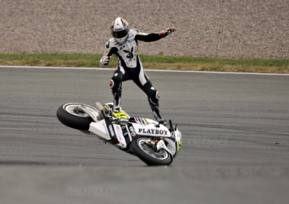 Inizio del 10° giro, curva a destra, lenta, cambio di direzione e gas in mano. Nella svolta veloce, destra-sinistra, le sospensioni della Honda di De Puniet si comprimono, il motore sale di giri e la gomma posteriore perde aderenza buttando in aria il pilota con un high side. Non sicuramente per colpa di una gomma fredda, ma la causa dovrebbe essere il malfunzionamento del traction control. Per la gara del Sachsenring il Team di Cecchinello ha infatti ricevuto la nuova elettronica Honda e al di là di una difficile messa a punto da ricercare,