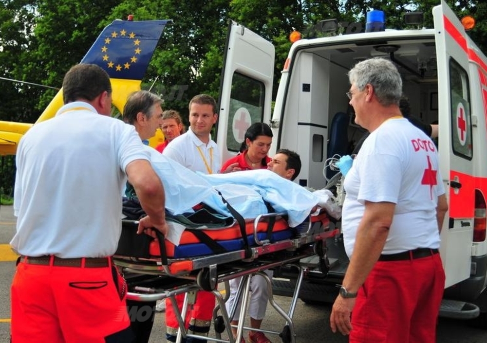 Esparagaro e Bautista che lo seguivano sono rimasti coinvolti nella caduta e Kallio apparentemente ha urtato violentemente la gamba sinistra di De Puniet mentre cercava di schivarlo. La gara è stata interrotta subito e il 29-enne è stato portato in Clinica Mobile per una radiografia che ha evidenziato la frattura della tibia e del perone della gamba sinistra. Il pilota ha lasciato il circuito in elicottero accompagnato dal Dottor Costa per raggiungere l’ospedale di Hartmannsdorf dove questa sera verrà operato.