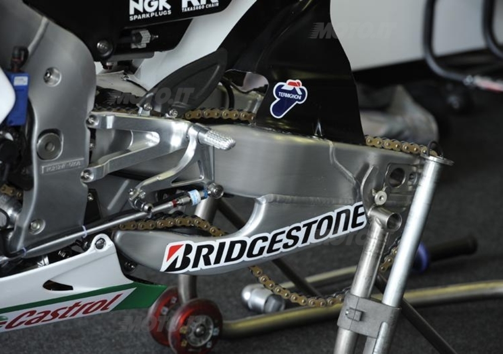Anche per quanto riguarda il forcellone, Dani Pedrosa si distingue dagli altri. Dopo aver provato al Mugello e nelle libere del GP di Germania quello nuovo, Pedrosa è tornato a correre con quello “vecchio”. Ma qual è la differenza, perlomeno visiva, tra i due forcelloni? La si può vedere nelle foto della gallery, che mostrano il forcellone della moto di Simoncelli (identico a quello che utilizzato Stoner e Dovizioso) e quello della RC212V di Pedrosa: osservate con attenzione dove c’è il perno del forcellone e vedrete che quella zona è leggermente differente.