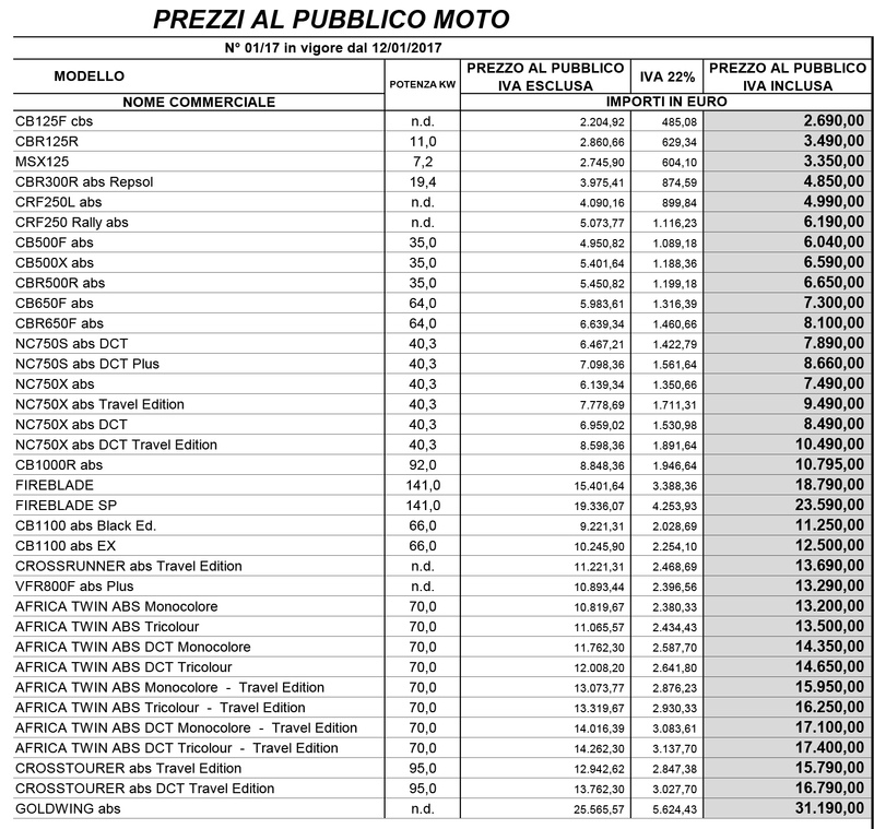 Honda svela il prezzo di lancio di X-ADV, fissato in 11.490 euro, e della nuova CBR1000RR Fireblade: 18.790 euro. Ai primi 1.000 clienti - e comunque non oltre il 28 febbraio 2017 - l'esclusivo maxiscooter crossover X-ADV è offerto con il top box personalizzato in alluminio e il navigatore satellitare Tom Tom Vio compresi nel prezzo. La potente supersportiva, che celebra quest’anno il 25° anniversario dalla nascita del primo modello, avrà in entrambe le versioni, standard ed SP, un prezzo in linea con la concorrenza: e se la CBR1000RR Fireblade costa 18.790 Euro f.c., la più preziosa CBR1000RR Fireblade SP è quotata a 23.590 euro f.c.