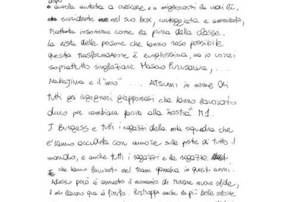 Con una lettera scritta di proprio pugno, Valentino dice addio a Yamaha, ricordando il lavoro fatto insieme per diventare quella coppia perfetta a cui si era arrivati. «Ma purtoppo anche le più belle storie d'amore finiscono» dice Valentino e «adesso è il momento di trovare nuove sfide, il mio lavoro qui è finito». Ringrazia tutti, tecnici dei box ed ingenieri, diventati compagni di un idillio durato sette anni.