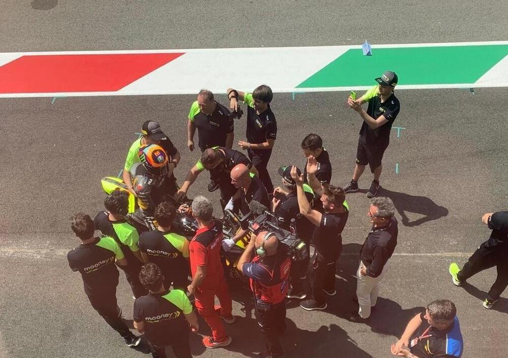 Con lo Zam eravamo seduti all’altezza della seconda fila e sotto di noi c’era il box della Mooney Vr46 che domenica alle 14,40 ha fatto una gran festa sia per Marini che per Bezzecchi.