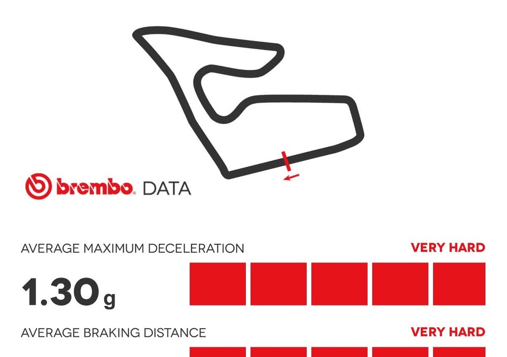 Durante un giro, i piloti della MotoGP utilizzano i freni sette volte per un totale di 25" (il record della pista è di 1’24”312). Anche le Formula 1 frenano sette volte ogni giro, ma per un totale di appena 8,3".