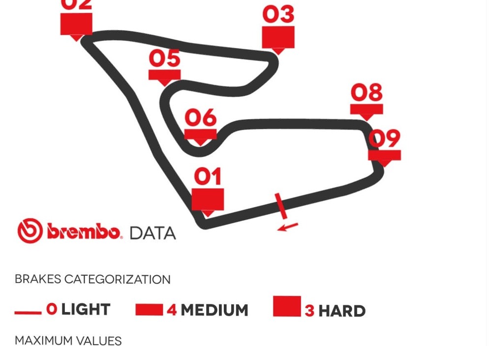 Il Red Bull Ring rientra nella categoria dei circuiti altamente impegnativi per i freni. In una scala da 1 a 5, dicono i tecnici Brembo che assistono il 100% delle MotoGP 2018, si è meritato un indice di difficoltà 5, valore raggiunto anche dalle piste di Barcellona, Motegi e Sepang.