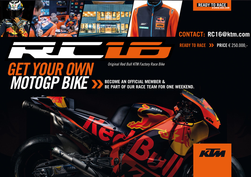 E' vero, è da tempo che auspichiamo l'arrivo sul mercato della KTM RC16, ma non intendevamo questo... Tornando seri, la Casa di Mattighofen fa un'offerta irrinunciabile ai collezionisti dal portafogli ben fornito: due RC16 ufficiali di quest'anno, complete dell'abbigliamento originale autografato di Pol Espargaró e della possibilità di vivere un fine settimana della MotoGP da veri VIP con il team KTM, sono state messe in vendita dal reparto corse alla cifra di 250.000 euro.