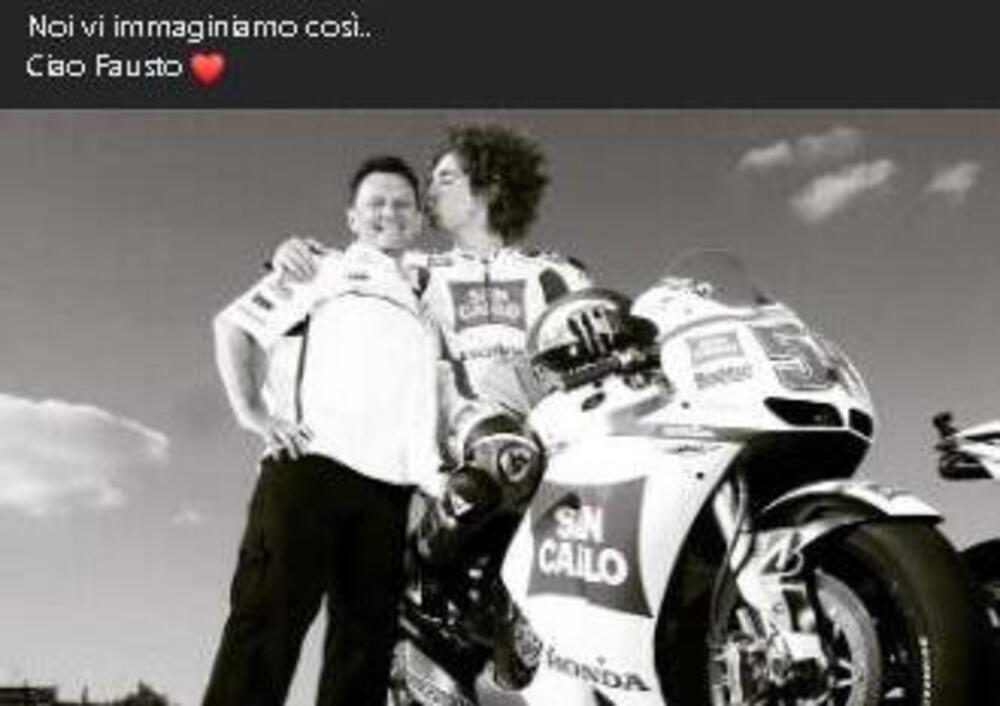 “Noi vi immaginiamo già così” , è la reazione più toccante alla notizia della scomparsa di Fausto Gresini. A pubblicarla è stata la pagina Facebook del Team Sic58 Squadra Corse, insieme a una foto di Fausto e Marco Simoncelli insieme accanto alla Honda con cui il Sic perse la vita a Sepang, nel 2011. Poche parole, una immagine che vale tutto e, per il resto, l’idea, o forse la semplice speranza, che chi si è voluto bene possa volersene ancora altrove.