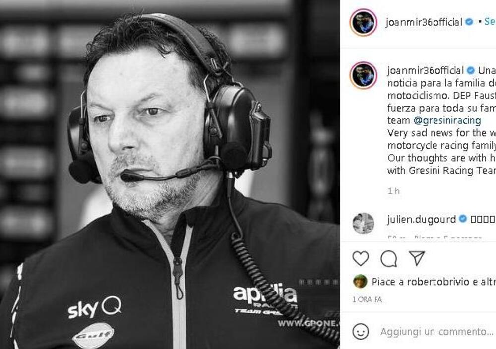 Anche il campione del mondo in carica della MotoGP, Joan Mir, ha voluto esprimere il suo cordoglio attraverso i social: “Una notizia terribile per tuttala grande famiglia del motociclismo e forza a tutta la sua famiglia”. "Ciao Fausto - ha scritto invece il Campione del Mondo della Moto2, Enea Bastianini - a sto giro ci hai fatto un brutto scherzo, grazie per tutto quello che hai fatto per me, per i primi 3 anni nel mondiale sei stato come un padre, mi hai fatto crescere tanto come pilota ma più che altro come persona, sarai sempre con me, ti voglio bene"