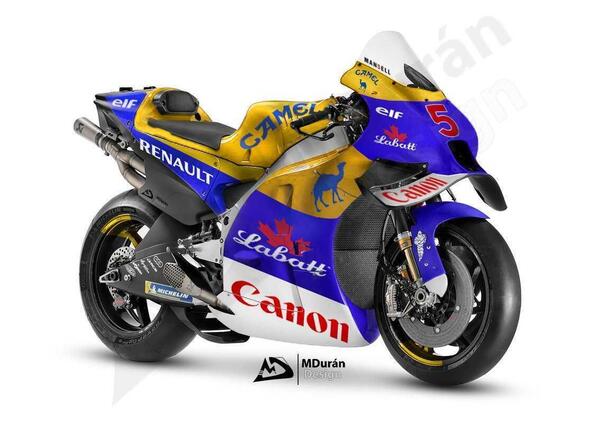 Così, qualche settimana fa, gli abbiamo scritto e gli abbiamo proposto un lavoro di stile: realizzare sulle MotoGP le livree di cinque storiche Formula 1 degli anni '80-'90: