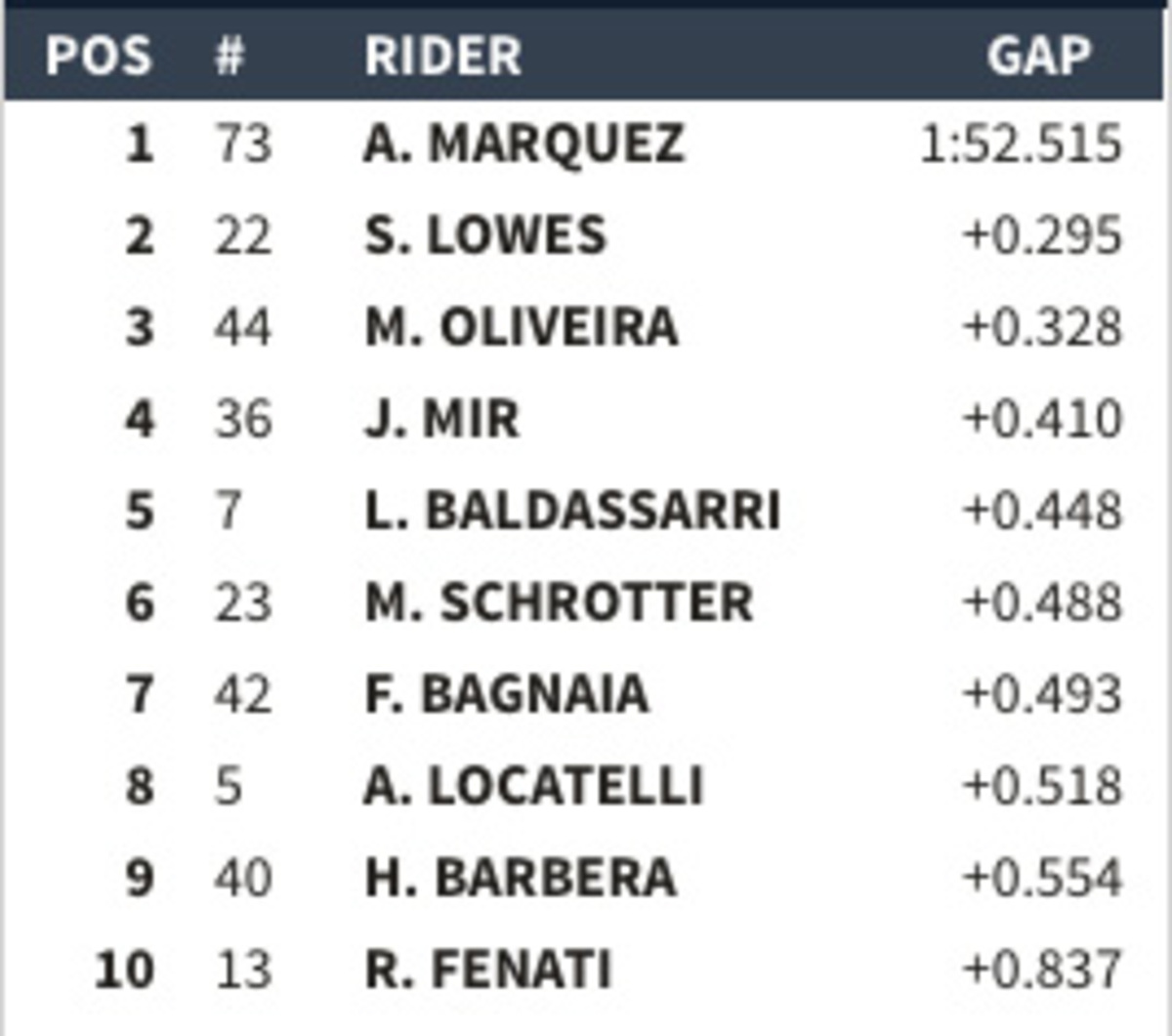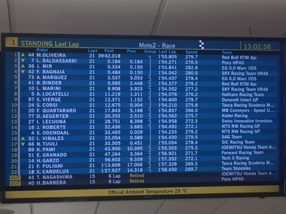 A 10 min dal termine: Mir, Marquez, Oliveira, Lowes, Schorotter, Fenati