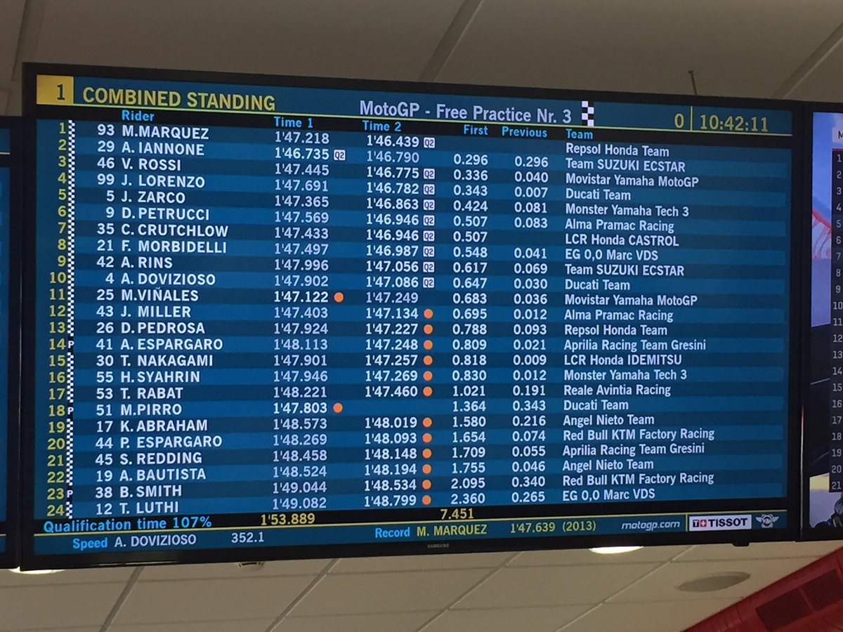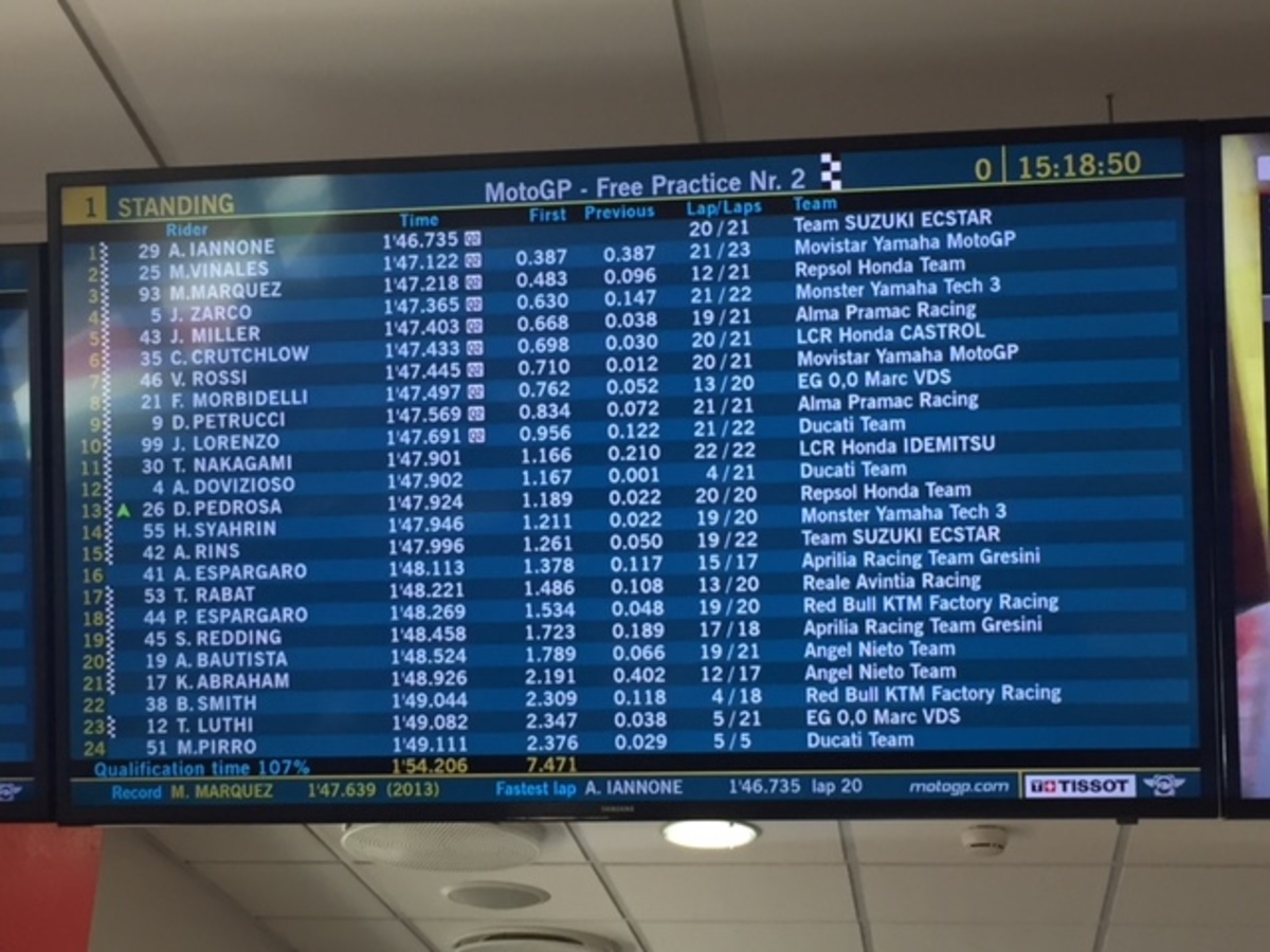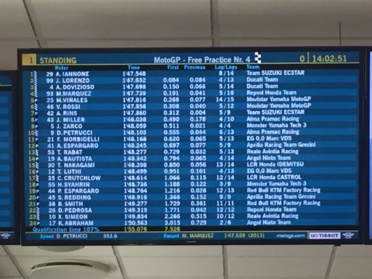 Per conquistare il primo posto in 1’47”253, Andrea Iannone ha montato una soffice nuova al posteriore, mentre con la media anteriore aveva fatto tre giri nell’uscita precedente;