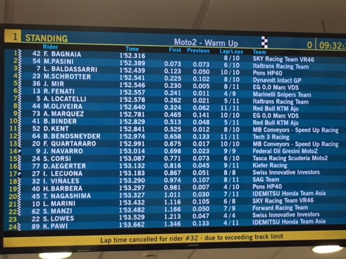 FP1 Moto2 iniziate ad 5 min e in testa c'è Pasini con a 0.027 da Marquez