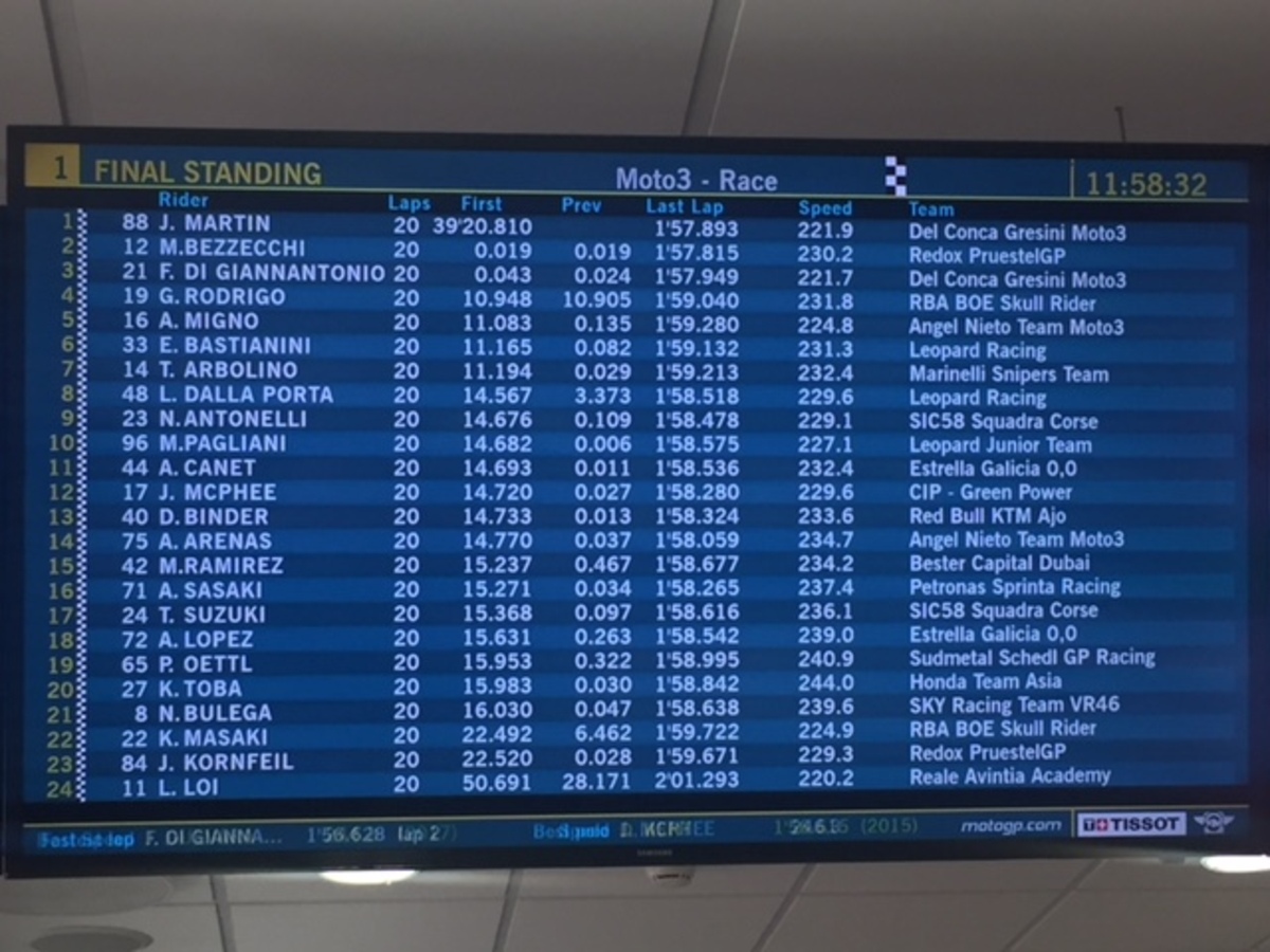 La tattica di Bezzecchi sembra chiara: passa in rettilineo, grazie a un super motore KTM, nettamente più potente di quello Honda, ma alla San Donato allarga per far ripassare Martin e farsi “tirare” nel misto. Così la fatica la fa lo spagnolo, lui può conservare meglio gomme ed energie.