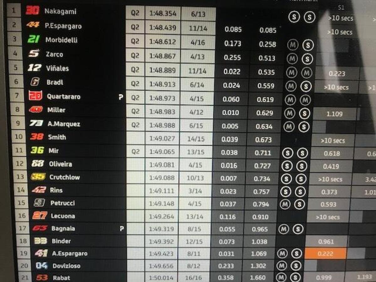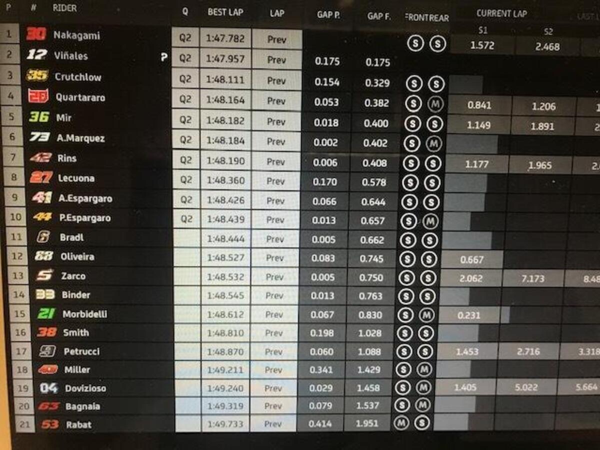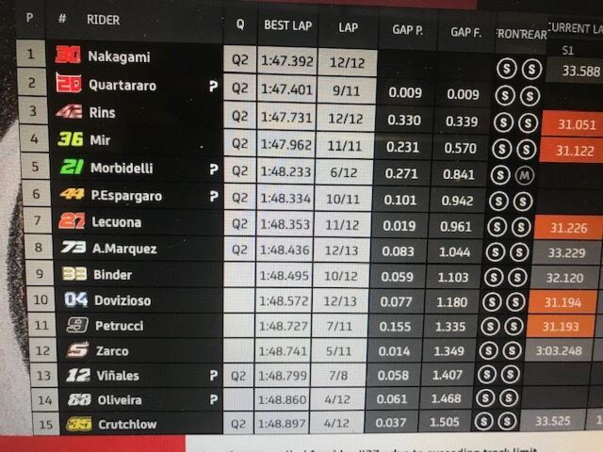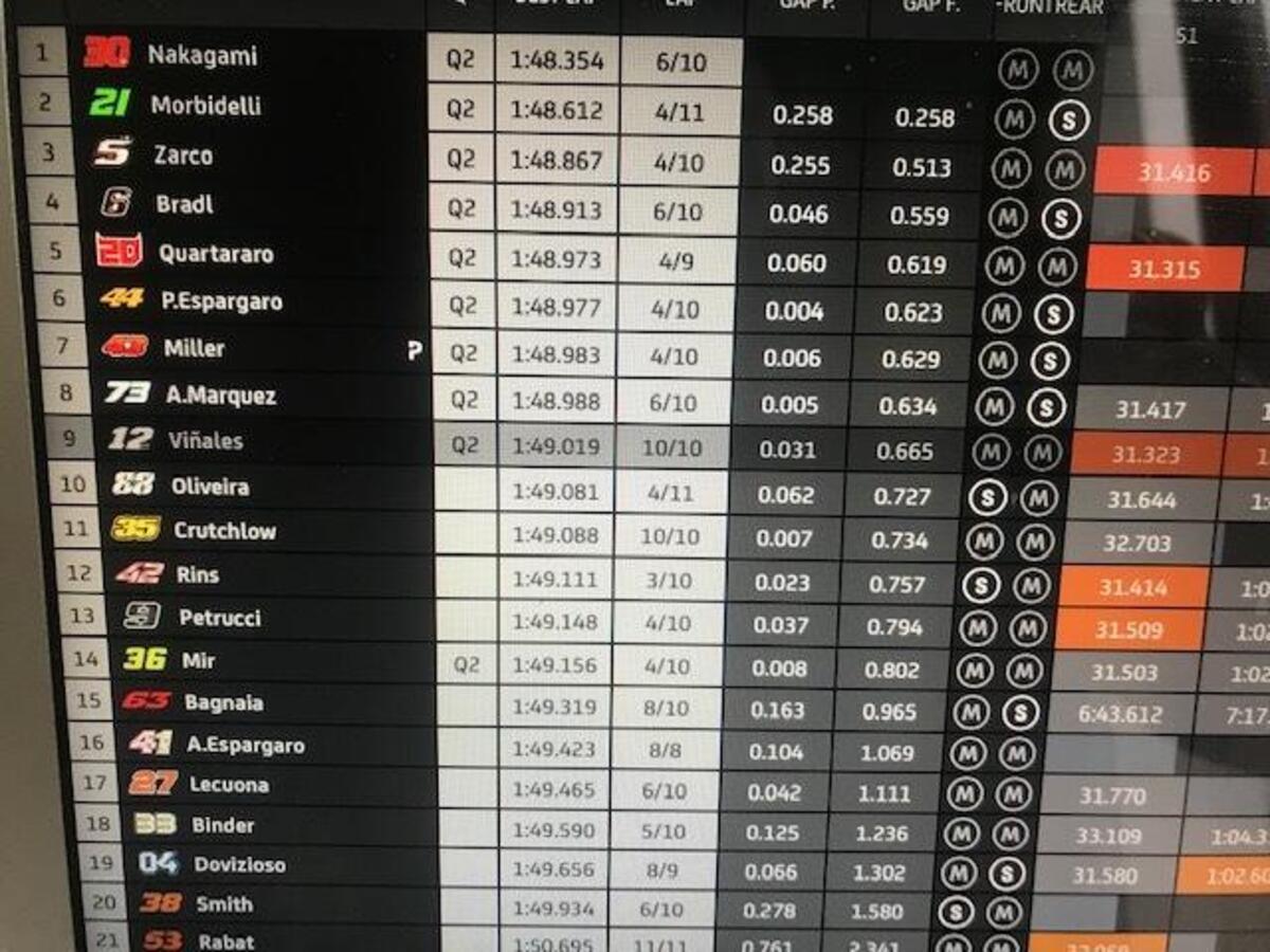 Fabio Quartararo: “Le qualifiche sono state dure: abbiamo fatto tanti cambiamenti sulla moto in questi giorni, cambiamenti positivi per il passo gara, ma non per il giro secco, non avevo feeling con le gomme nuove. Ma il mio passo è buono, sono molto fiducioso per la gara.
