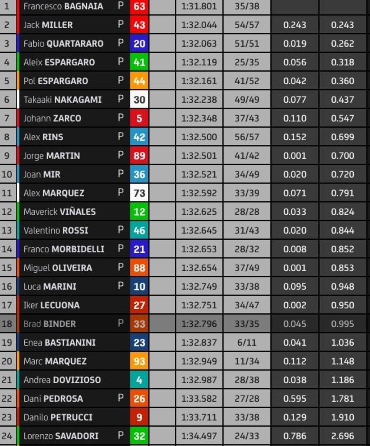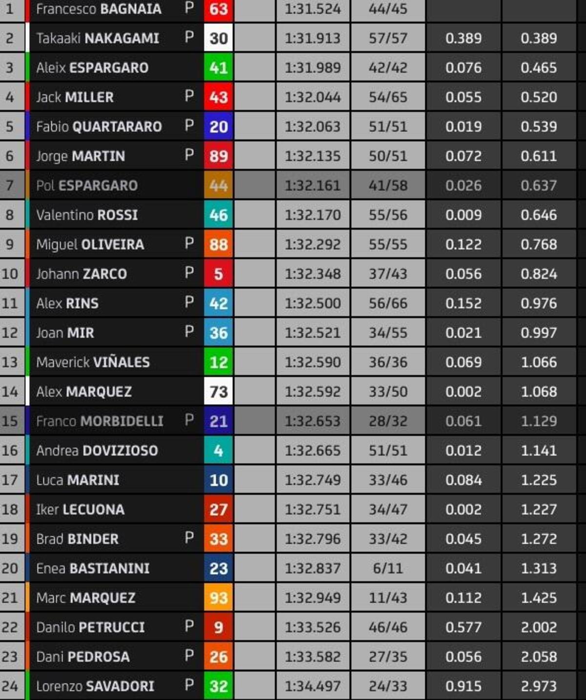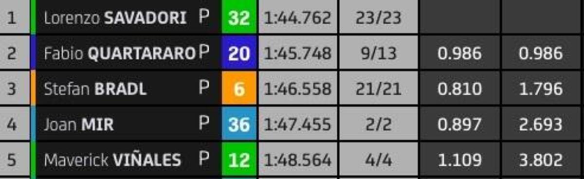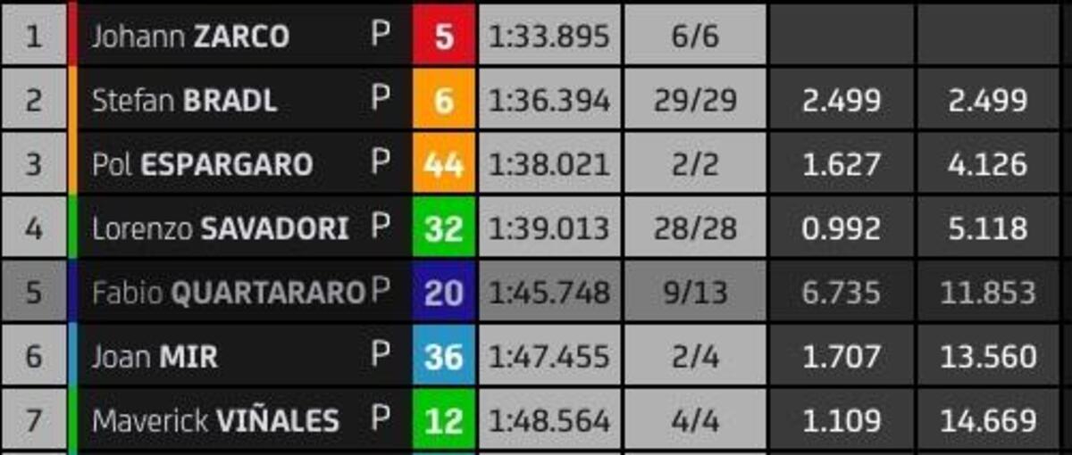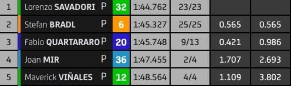 Quartararo 1’45”748 (9); Savadori 1’46”603 (11) ; Bradl 1’47”299 (14); Vinales 1’48”554 (4)