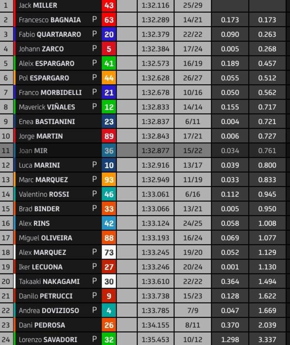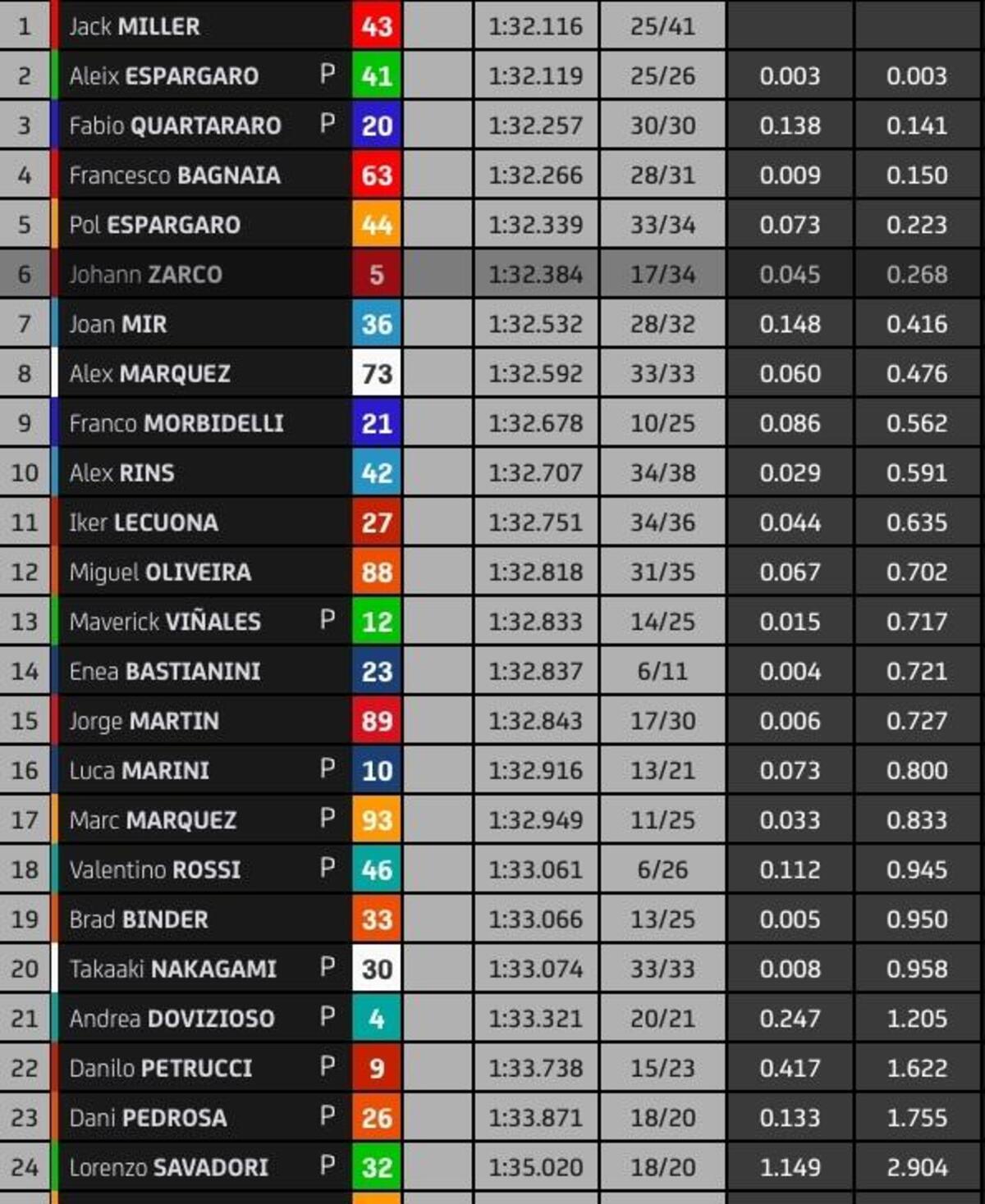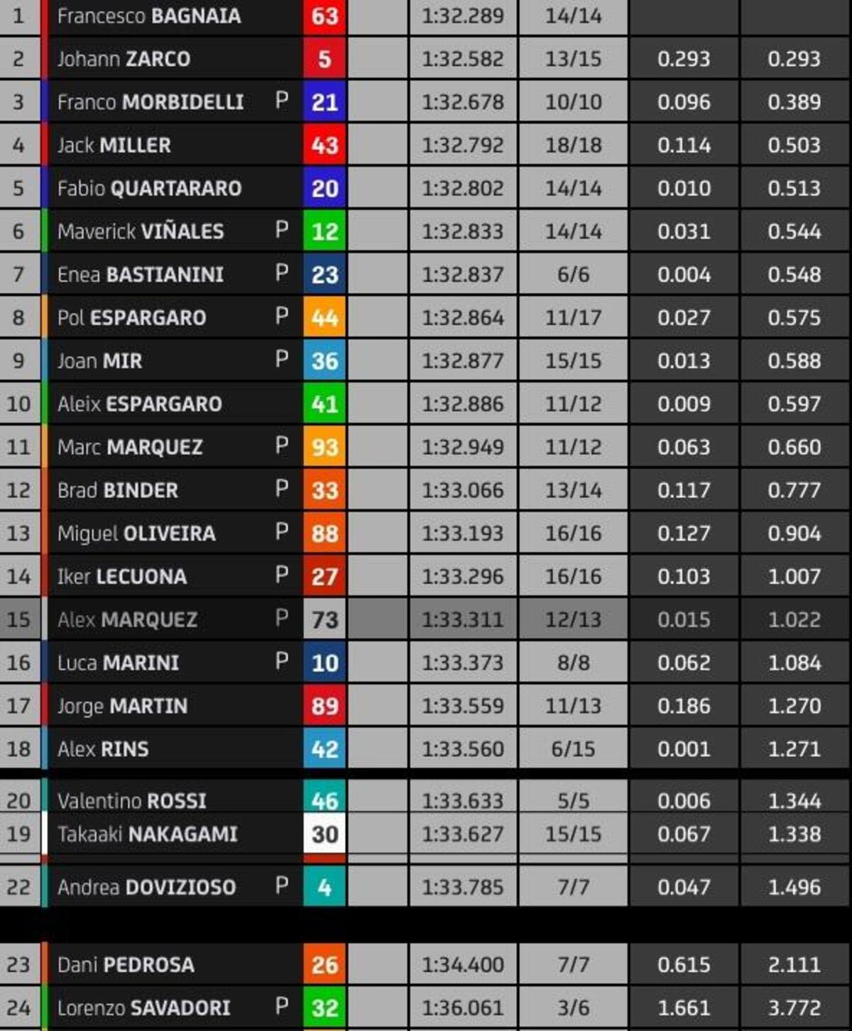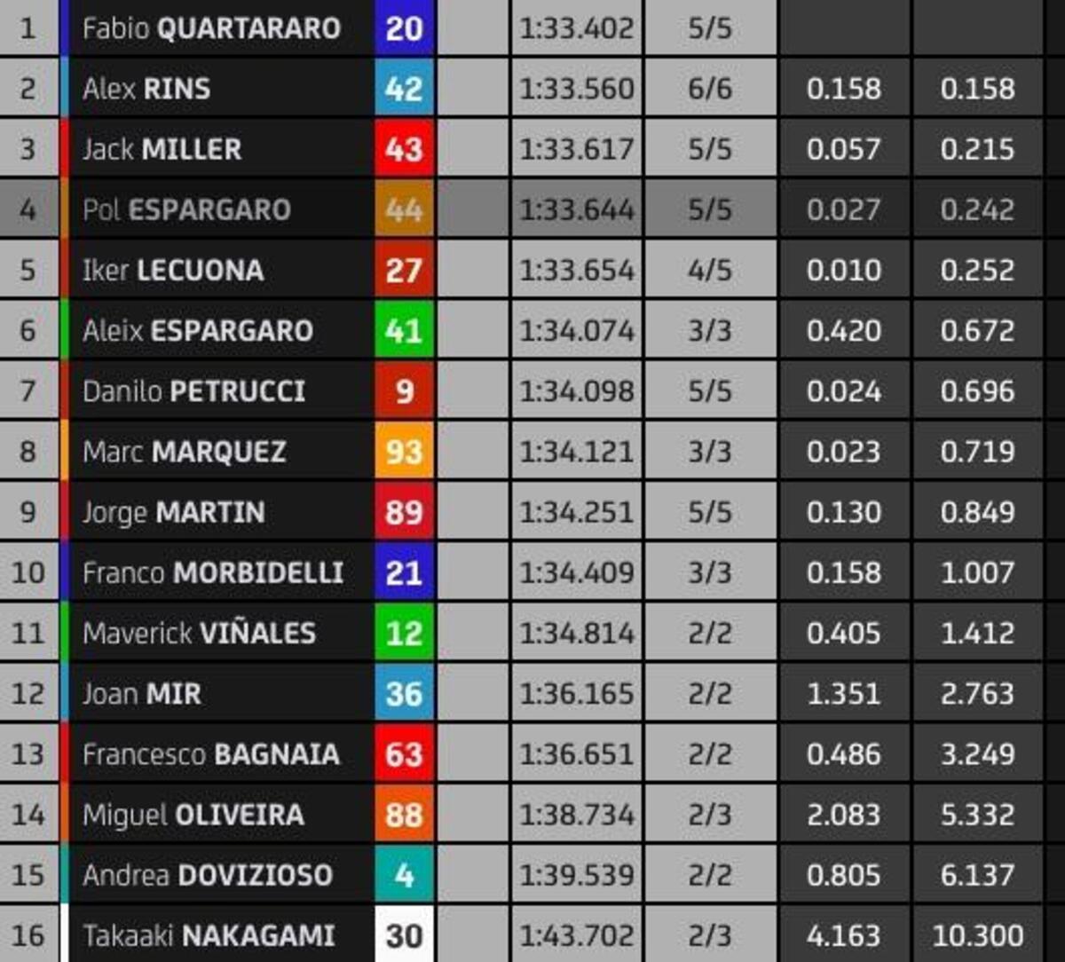 Quartararo 1’45”748 (9); Savadori 1’46”603 (11) ; Bradl 1’47”299 (14); Vinales 1’48”554 (4)