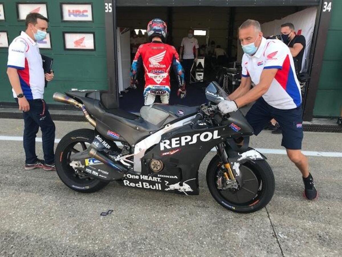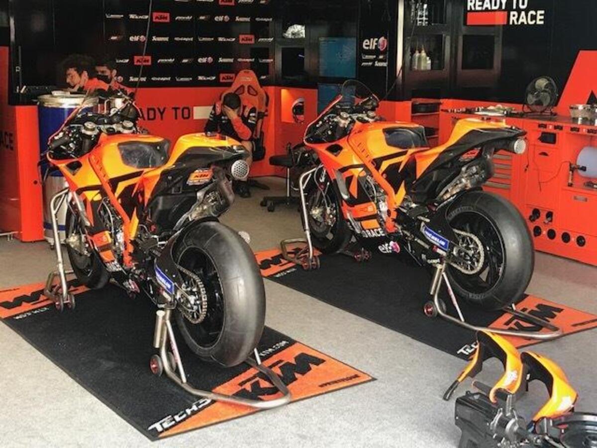 Una delle due moto di binder viene portata all’interno del box di Dani
