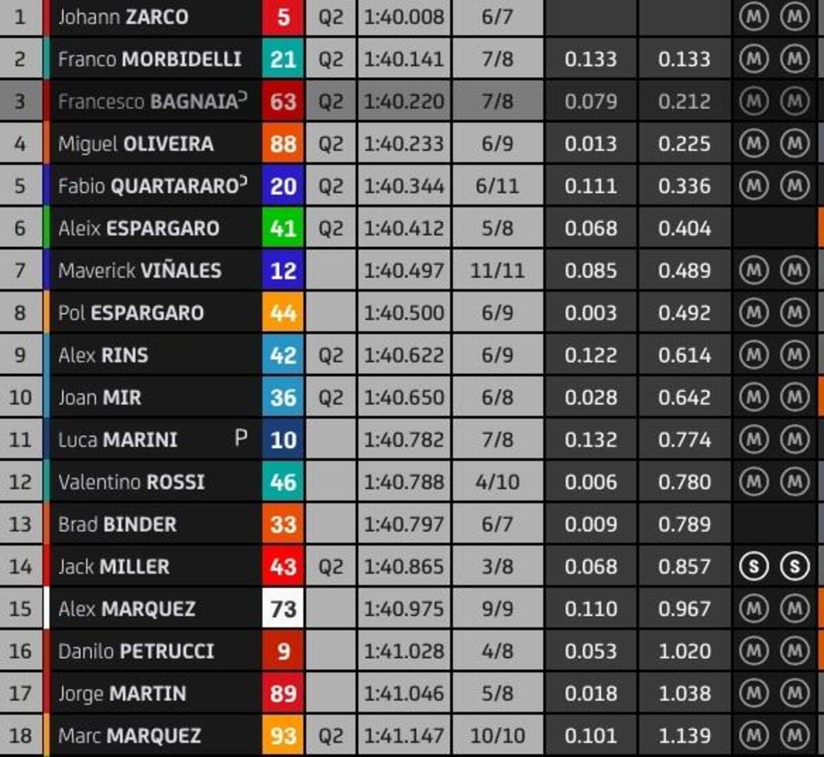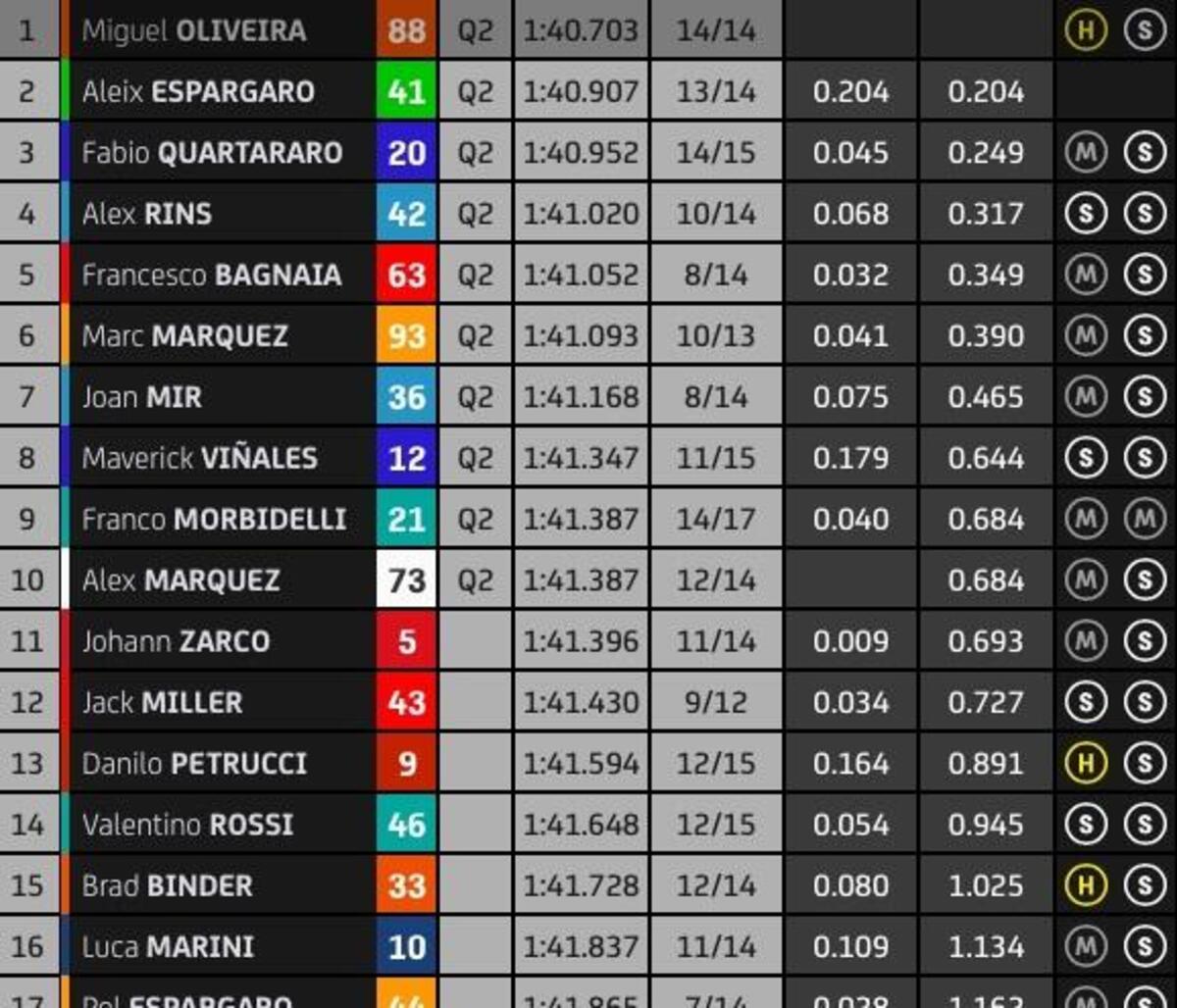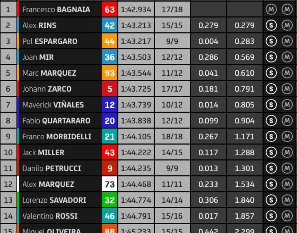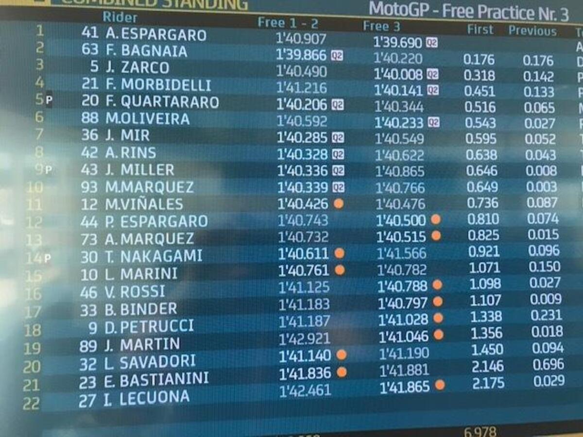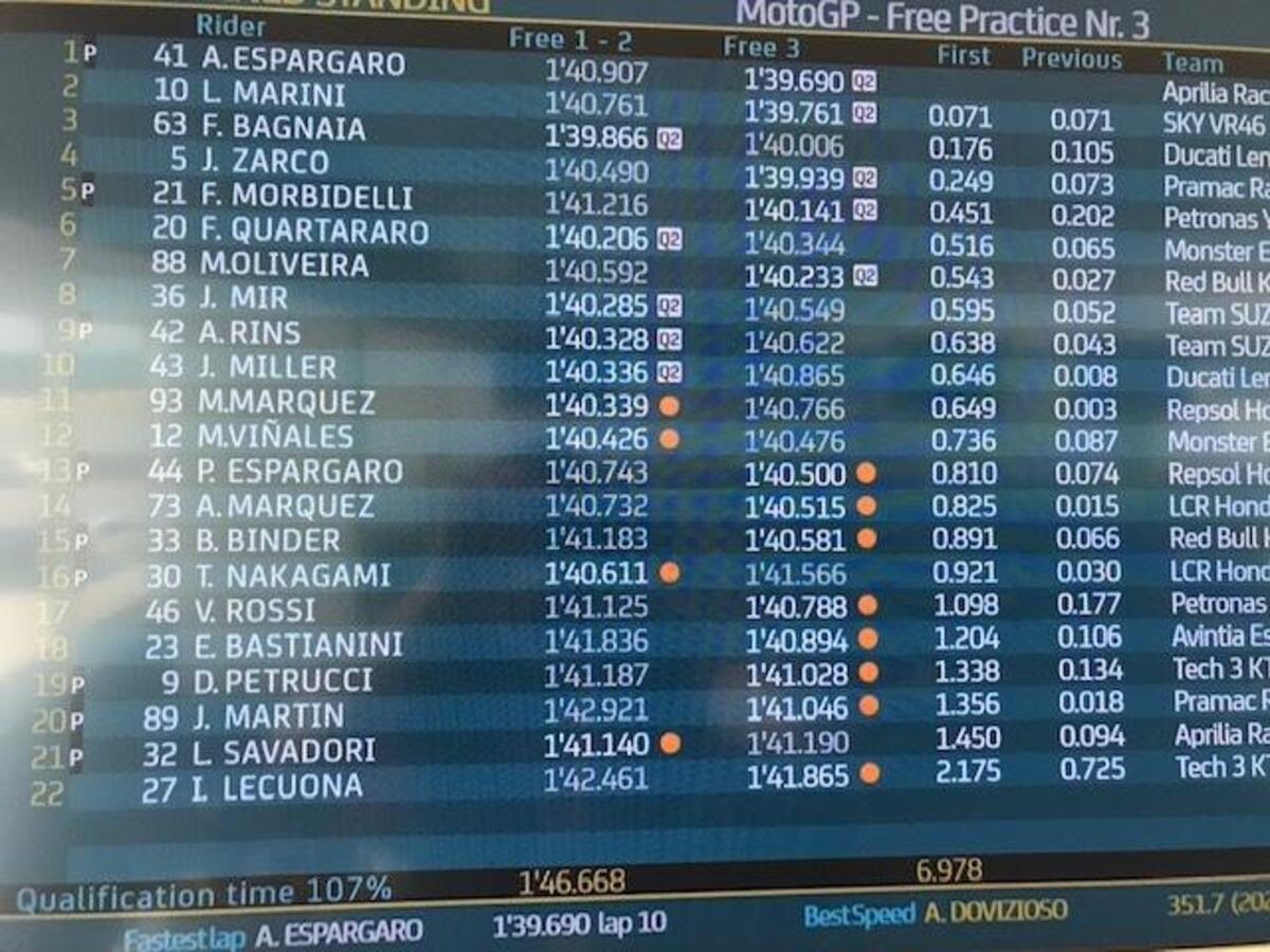 “T4? Rispetto a stamattina ho tolto due decimi nell’ultimo settore, lì la Yamaha è molto competitiva, noi lo siamo nel T2 e nel T3. Sto lavorando molto per avere un buon feeling anche nel T4, solo Quartararo ha fatto un po’ meglio alla fine, anche Zarco è più veloce di me in quel settore, questo mi permette di studiare i suoi dati. Quest’anno guido più rilassato e posso conservare le gomme, spingere al 100% nel time attack.