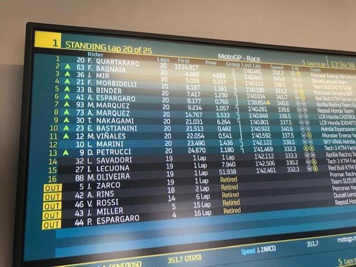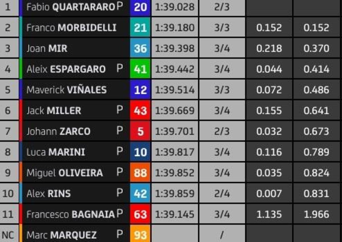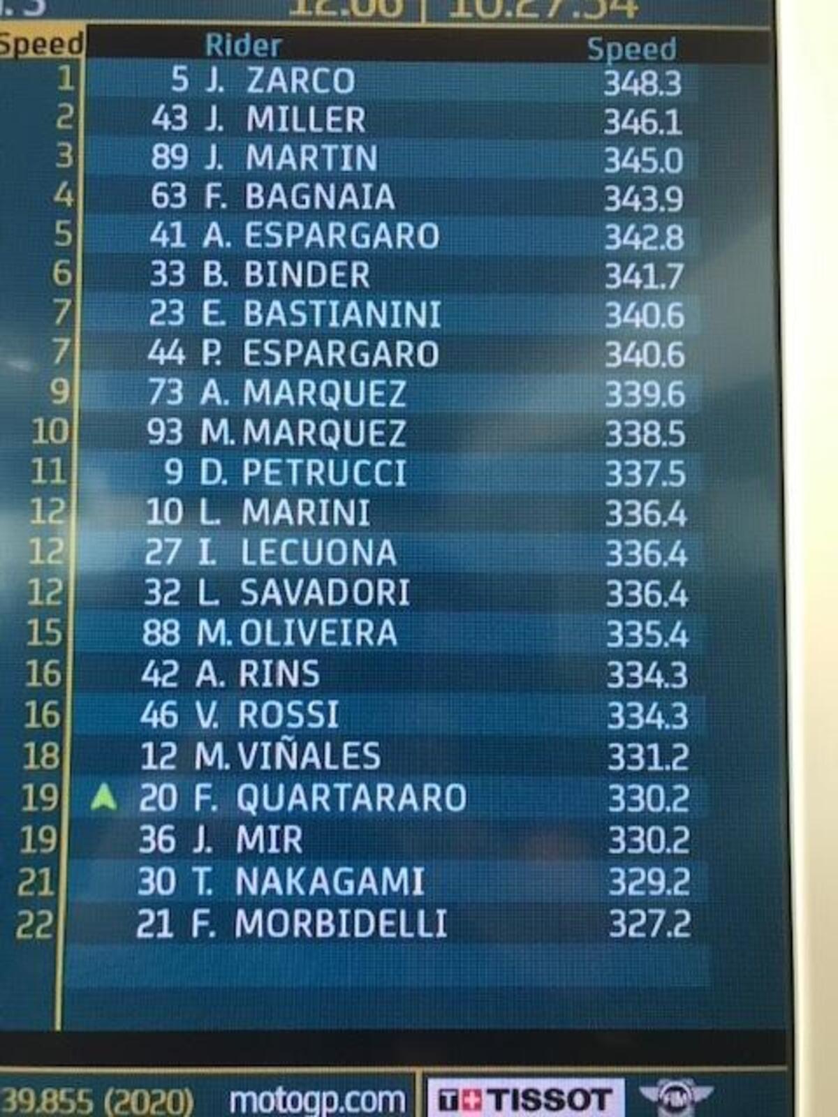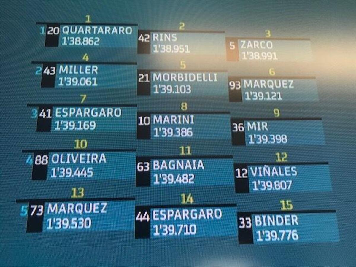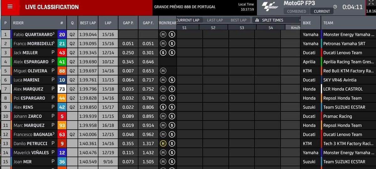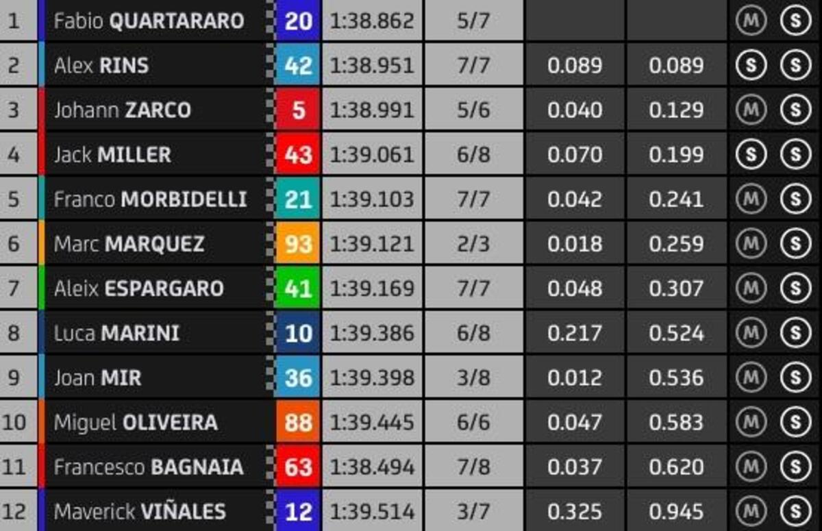 “T4? Rispetto a stamattina ho tolto due decimi nell’ultimo settore, lì la Yamaha è molto competitiva, noi lo siamo nel T2 e nel T3. Sto lavorando molto per avere un buon feeling anche nel T4, solo Quartararo ha fatto un po’ meglio alla fine, anche Zarco è più veloce di me in quel settore, questo mi permette di studiare i suoi dati. Quest’anno guido più rilassato e posso conservare le gomme, spingere al 100% nel time attack.