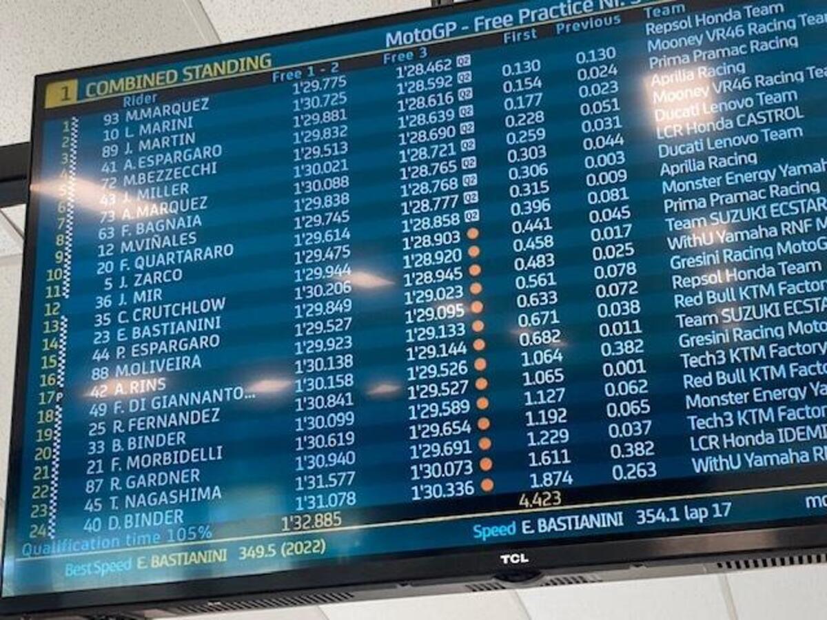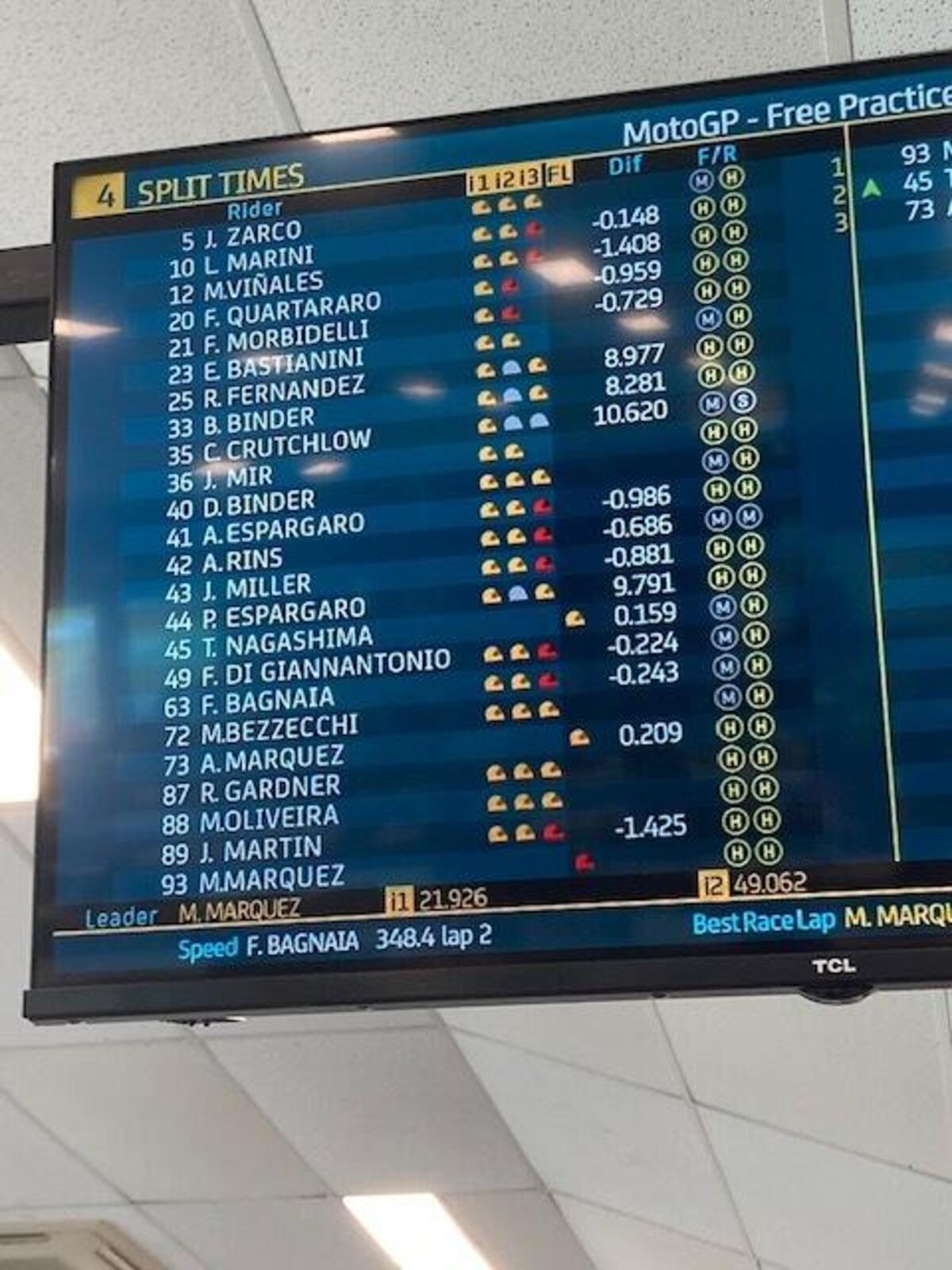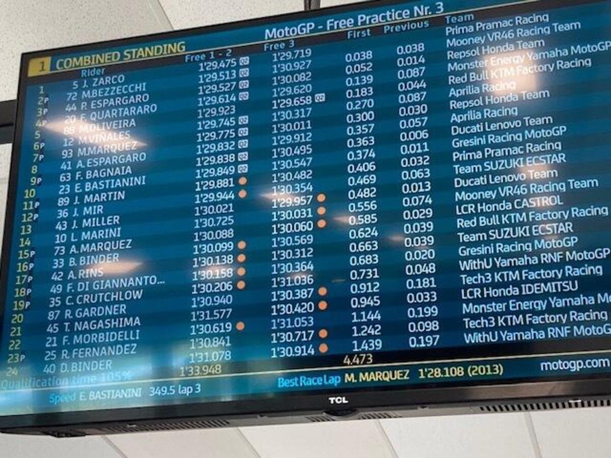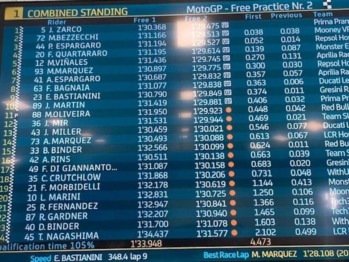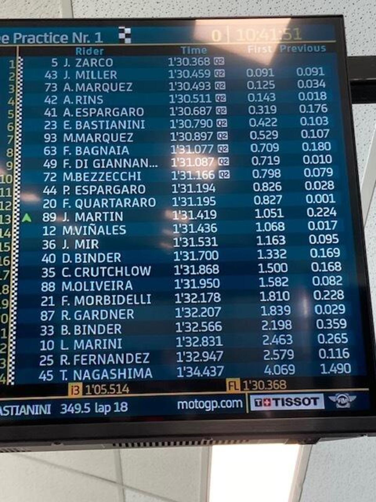 Johann Zarco si conferma il più veloce , davanti a Marco Bezzecchi e Pol Espargaro, racchiusi in 0”052. Fabio Quartararo quarto, Aleix Espargaro settimo, Francesco Bagnaia ottavo, Enea Bastianini nono e jack Miller 13esimo. Atri italiani: 17esimo Fabio Di Giannantonio, 19esimo Franco Morbidelli, 20esimo Luca Marini, in una sessione asciutta nella quale tutti i piloti, nessuno escluso, ha fatto almeno un “attacco al tempo”.