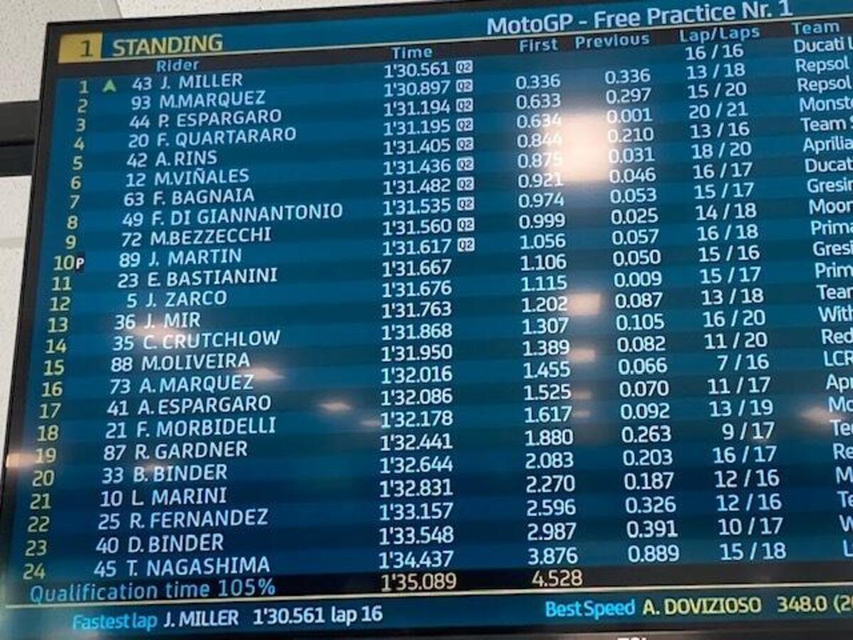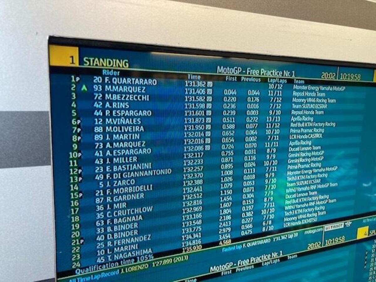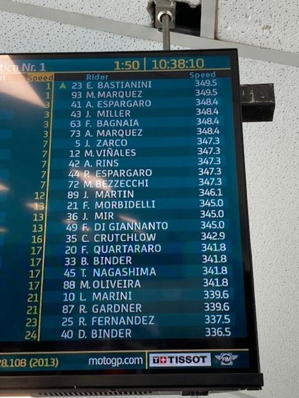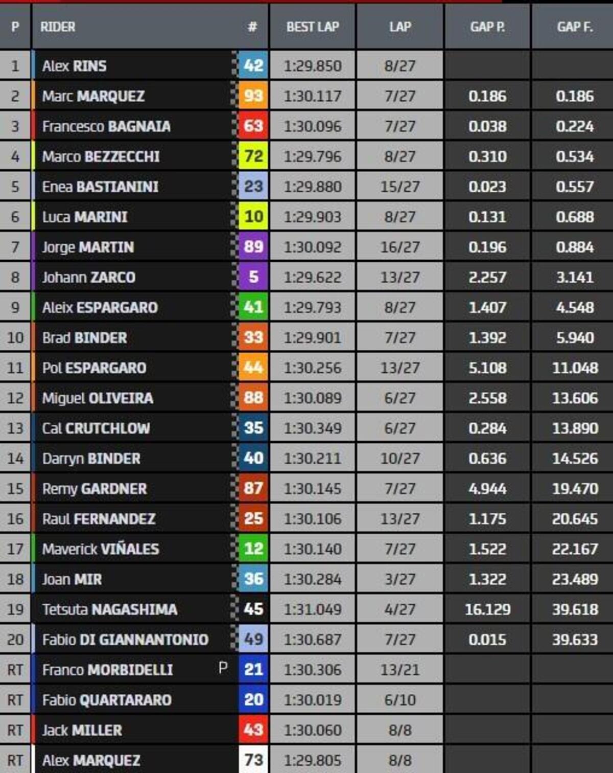 Johann Zarco si conferma il più veloce , davanti a Marco Bezzecchi e Pol Espargaro, racchiusi in 0”052. Fabio Quartararo quarto, Aleix Espargaro settimo, Francesco Bagnaia ottavo, Enea Bastianini nono e jack Miller 13esimo. Atri italiani: 17esimo Fabio Di Giannantonio, 19esimo Franco Morbidelli, 20esimo Luca Marini, in una sessione asciutta nella quale tutti i piloti, nessuno escluso, ha fatto almeno un “attacco al tempo”.