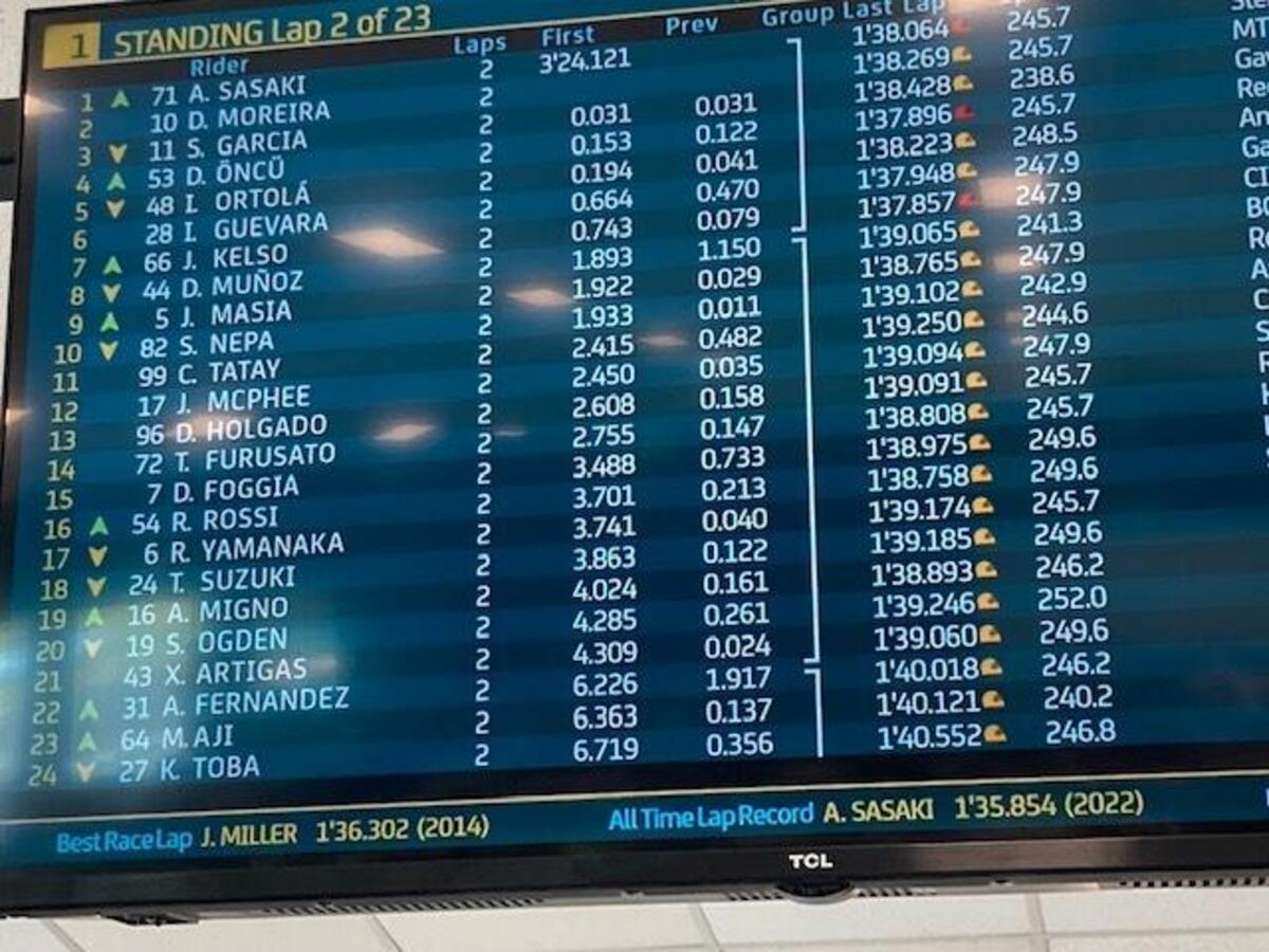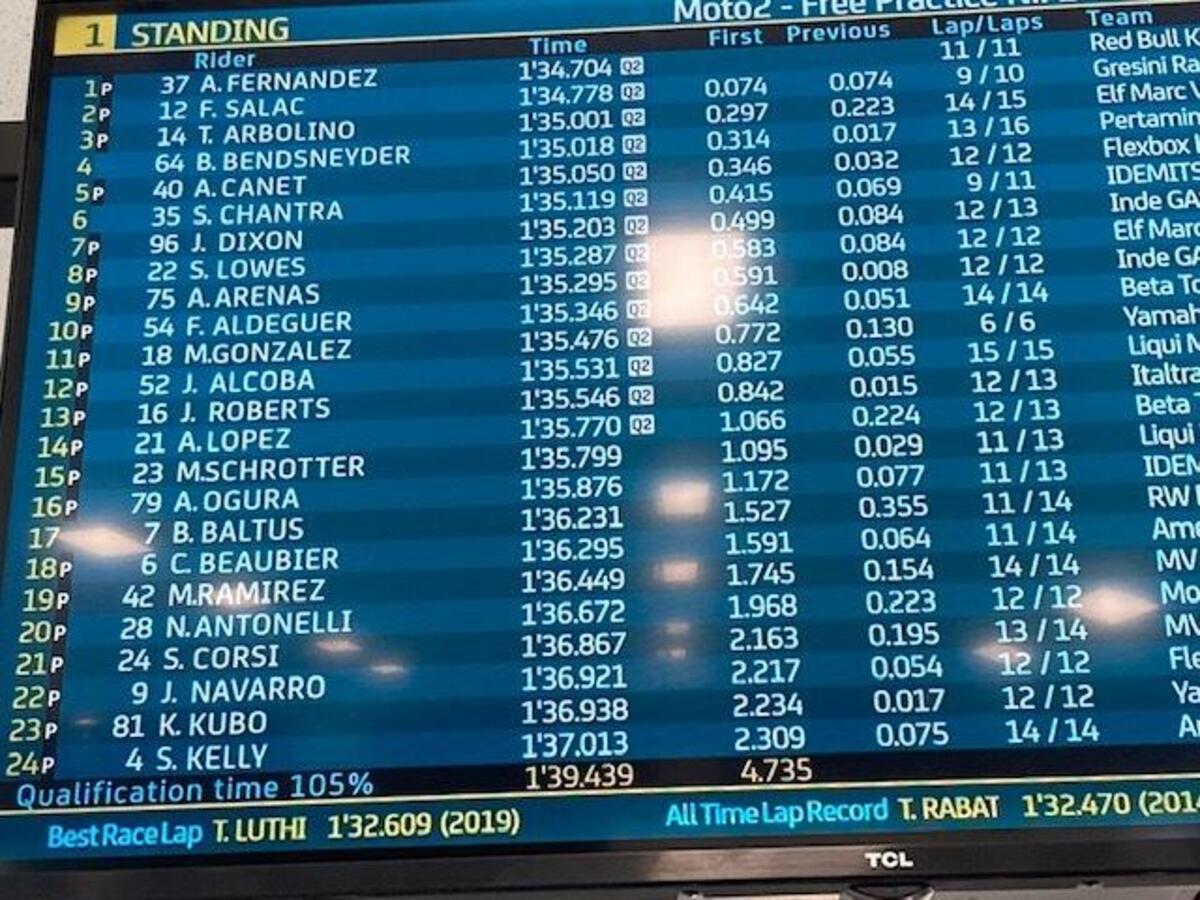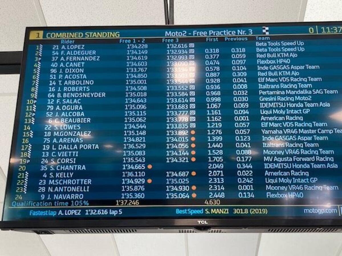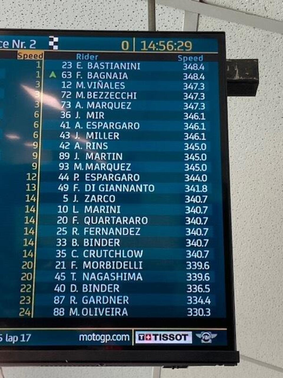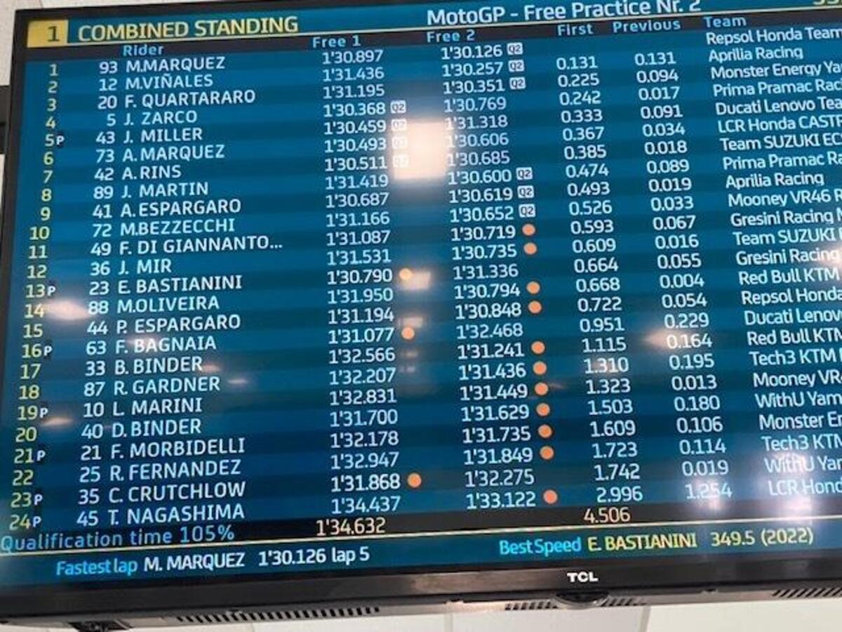 Johann Zarco si conferma il più veloce , davanti a Marco Bezzecchi e Pol Espargaro, racchiusi in 0”052. Fabio Quartararo quarto, Aleix Espargaro settimo, Francesco Bagnaia ottavo, Enea Bastianini nono e jack Miller 13esimo. Atri italiani: 17esimo Fabio Di Giannantonio, 19esimo Franco Morbidelli, 20esimo Luca Marini, in una sessione asciutta nella quale tutti i piloti, nessuno escluso, ha fatto almeno un “attacco al tempo”.