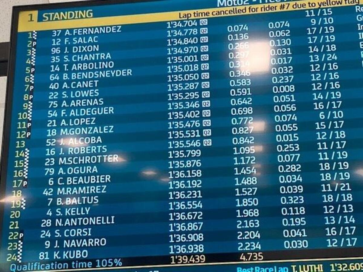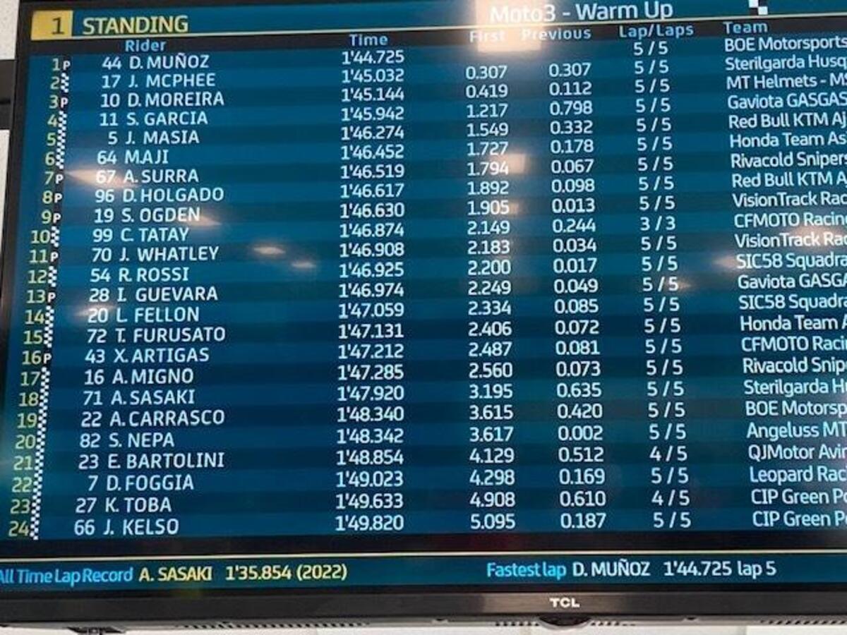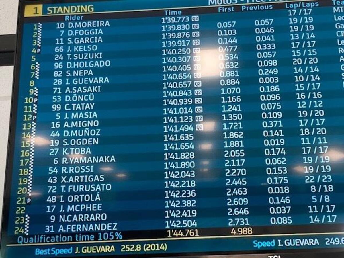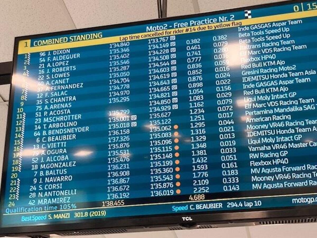 Johann Zarco si conferma il più veloce , davanti a Marco Bezzecchi e Pol Espargaro, racchiusi in 0”052. Fabio Quartararo quarto, Aleix Espargaro settimo, Francesco Bagnaia ottavo, Enea Bastianini nono e jack Miller 13esimo. Atri italiani: 17esimo Fabio Di Giannantonio, 19esimo Franco Morbidelli, 20esimo Luca Marini, in una sessione asciutta nella quale tutti i piloti, nessuno escluso, ha fatto almeno un “attacco al tempo”.