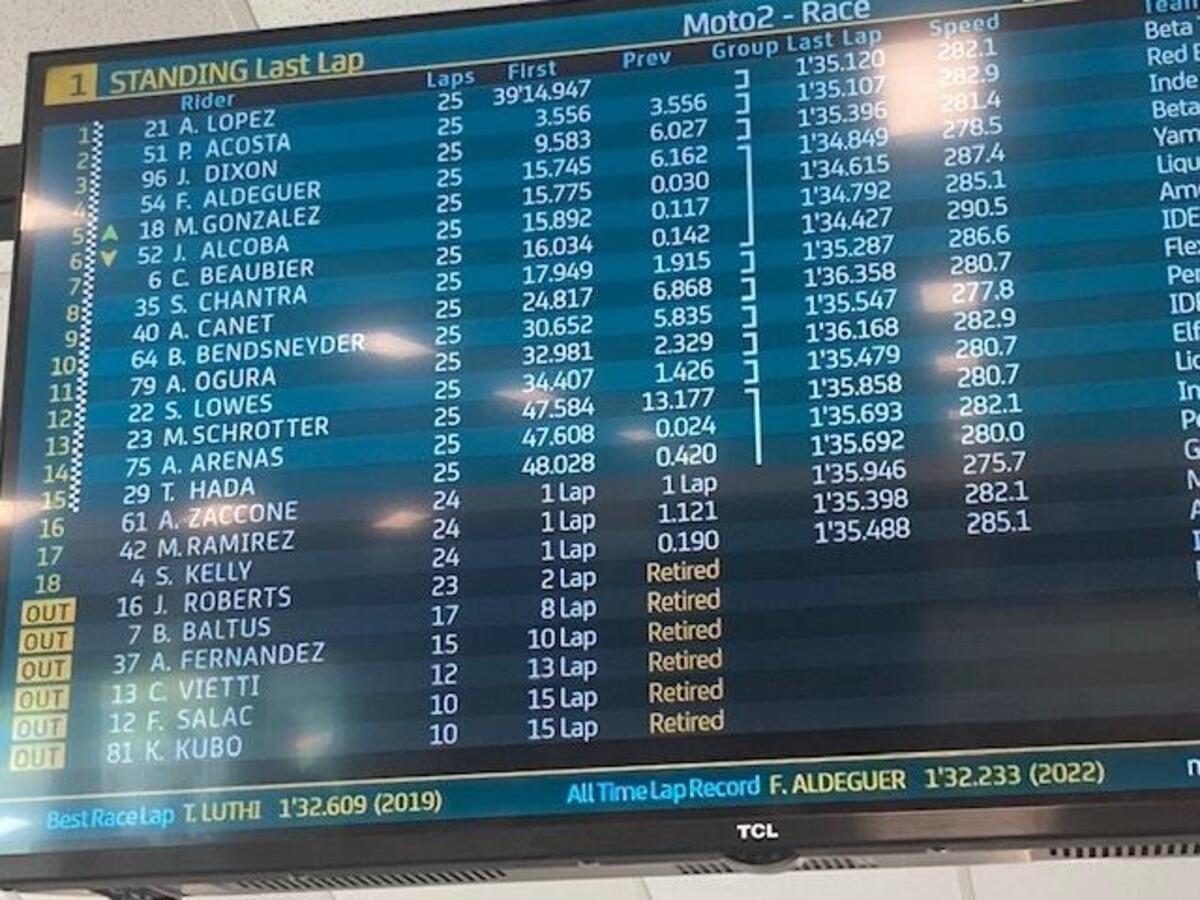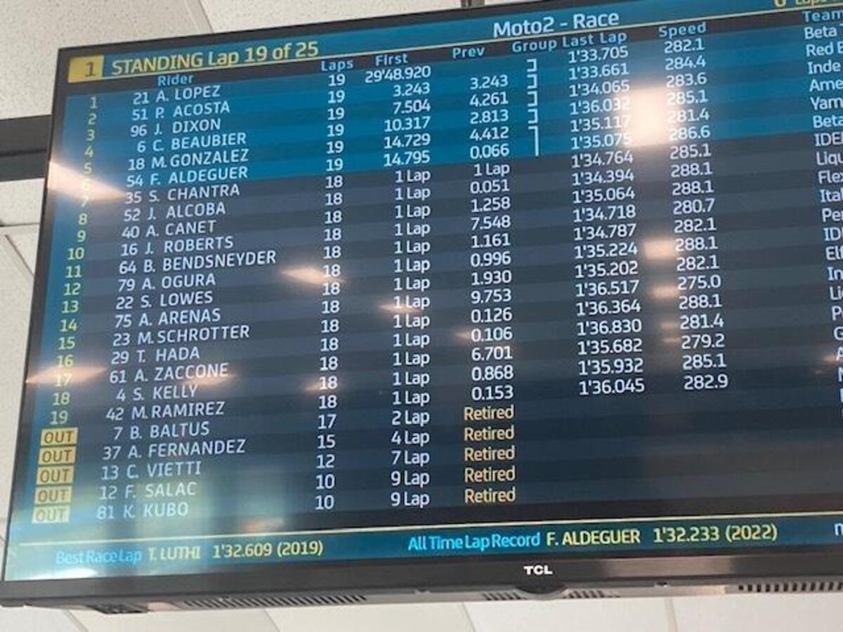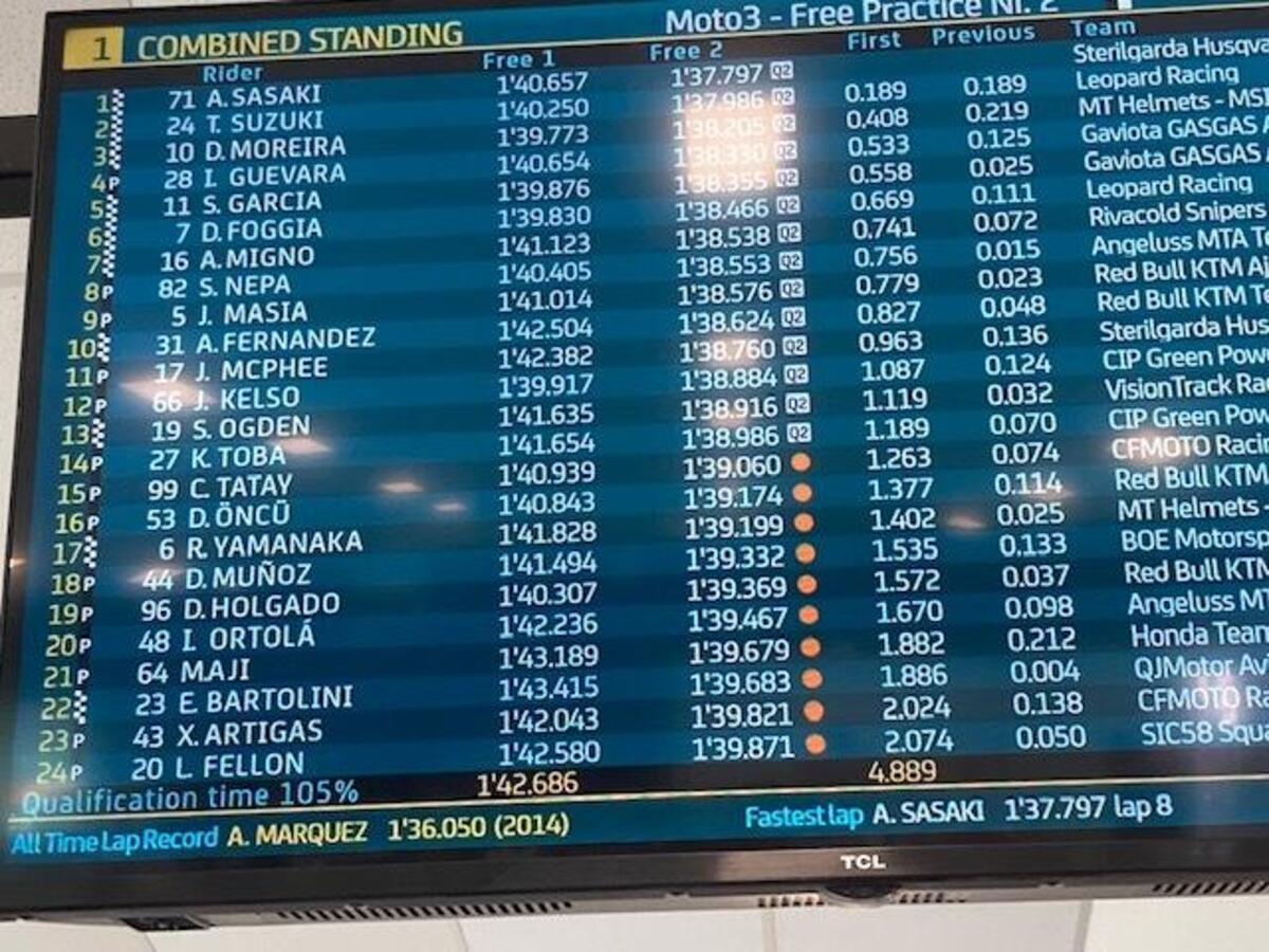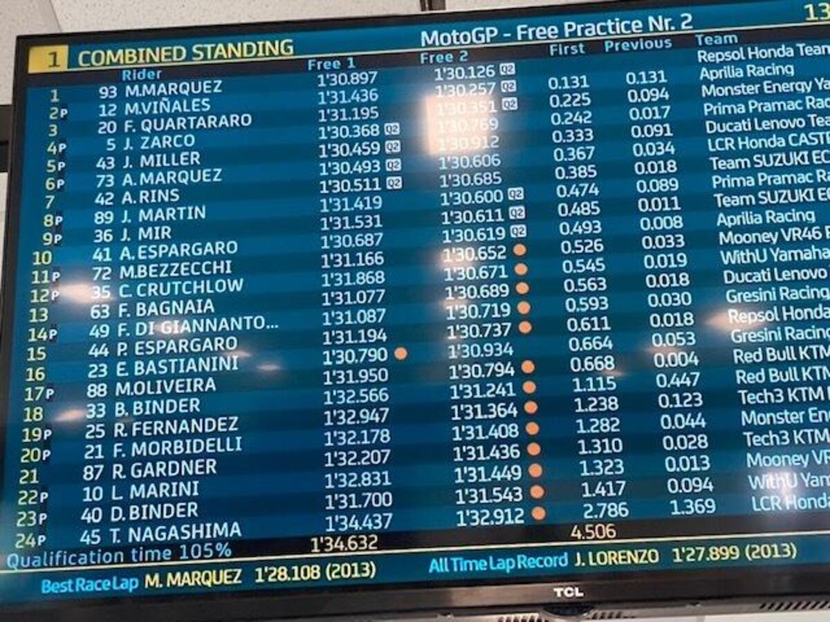 Quinto posto per Maverick Vinales, settimo per Aleix Espargaro: entrambi hanno fatto un miglioramento sulla distanza rispetto a questa mattina, ma dentro al box si sperava in qualcosa di meglio, si pensava che la RS-GP potesse essere più efficace su una pista dove, di fatto, non si usa l’abassattore posteriore. In difficoltà anche la KTM (il migliore è Oliveira, 11esimo), in calo la Suzuki dopo FP1 nelle quali Rins aveva tenuto un gran passo. Anche nelle FP2, per la verità, ha tenuto una buona costanza, ma nel giro secco Joan Mir è 12esimo e Alex Rins è 16esimo.
