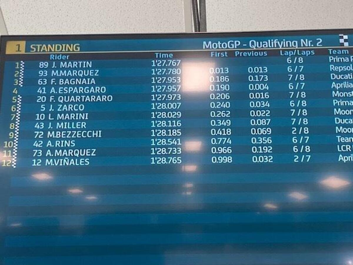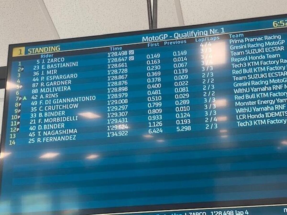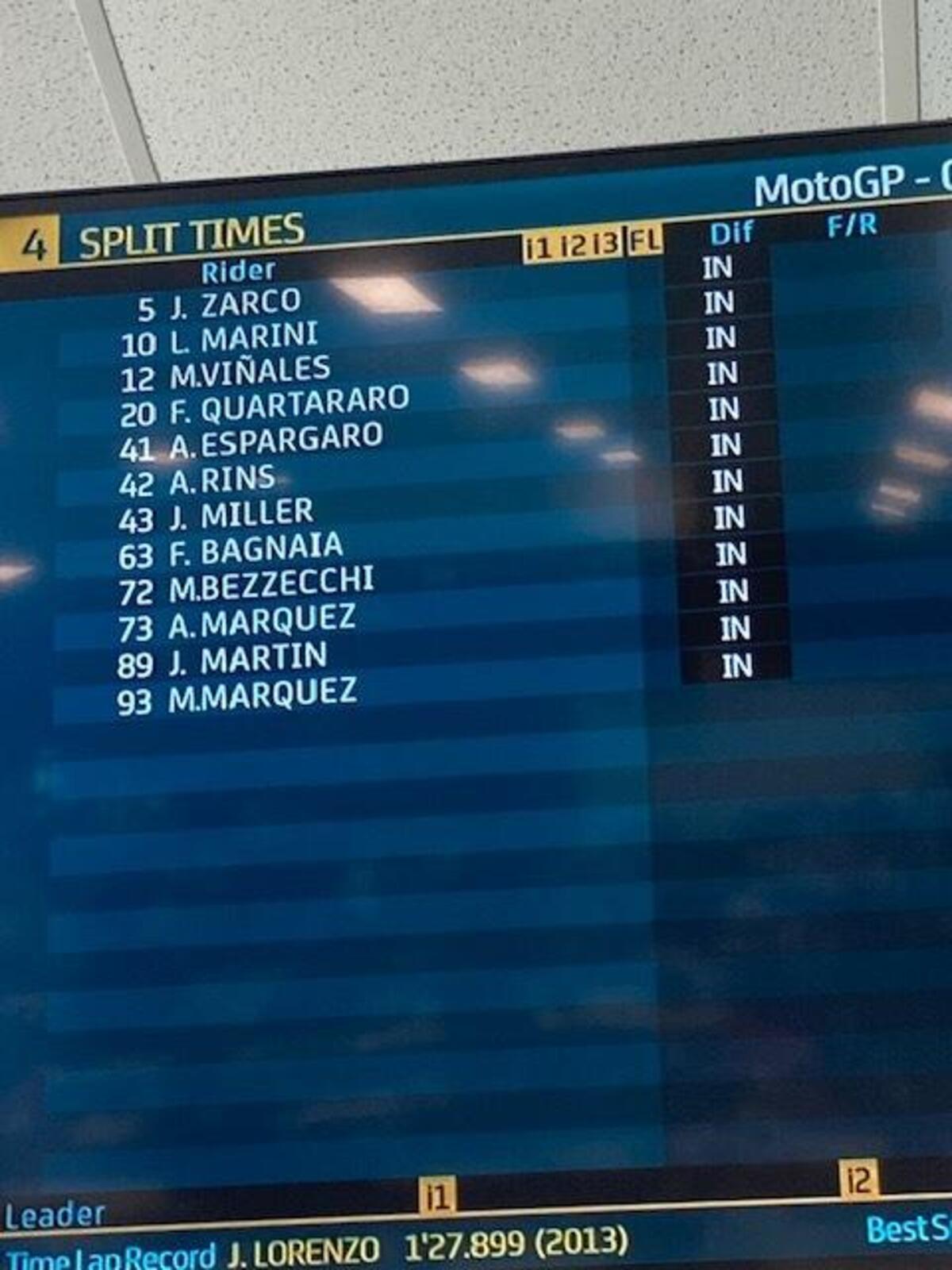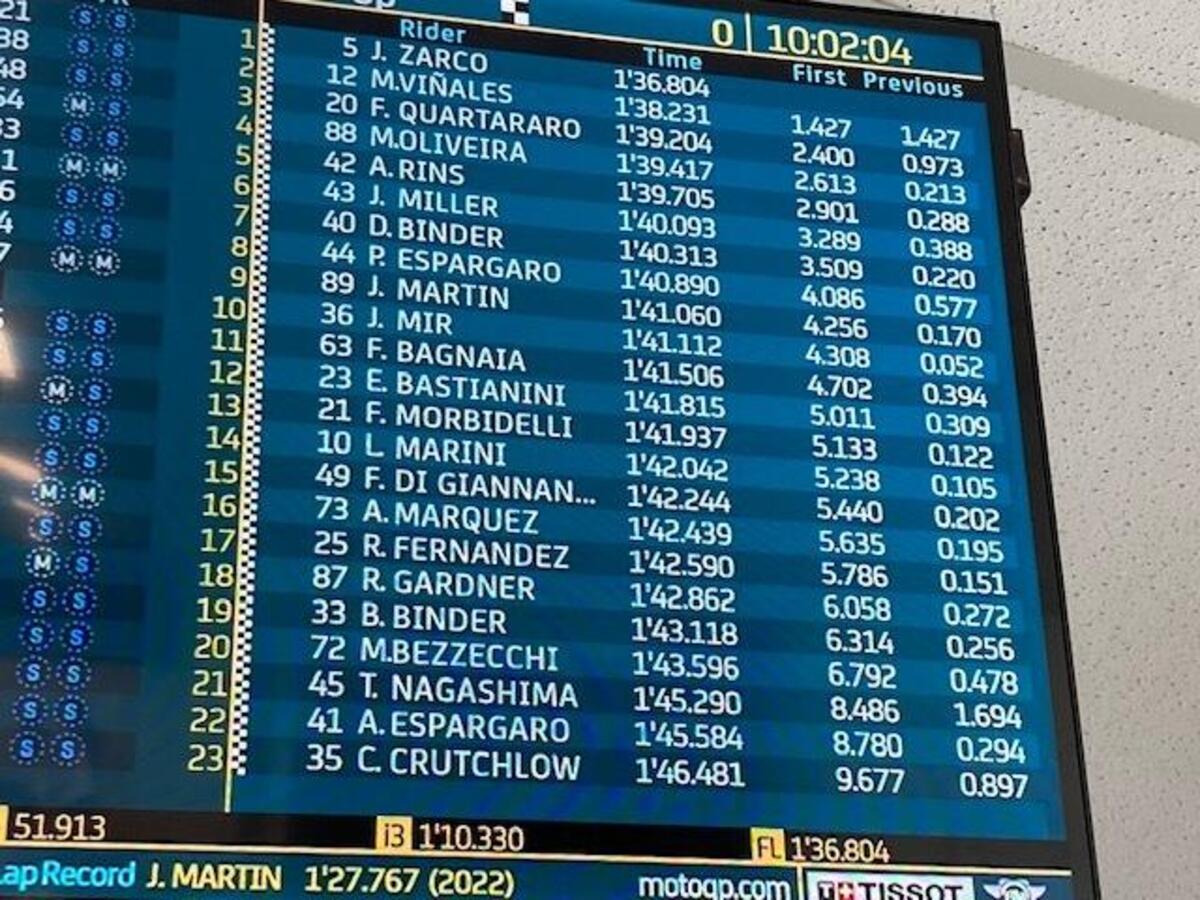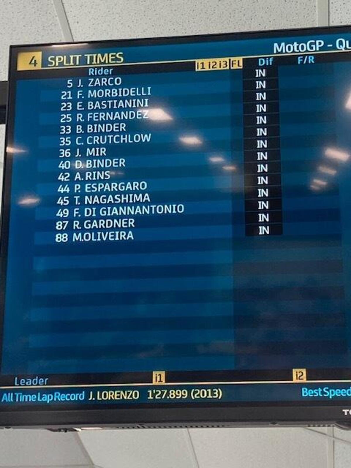 Ecco i dieci al momento in Q2: Zarco, Bezzecchi, P.Espargaro, Quartararo, Vinales, Marquez, A.Espargaro, Bagnaia, Bastianini e Martin=