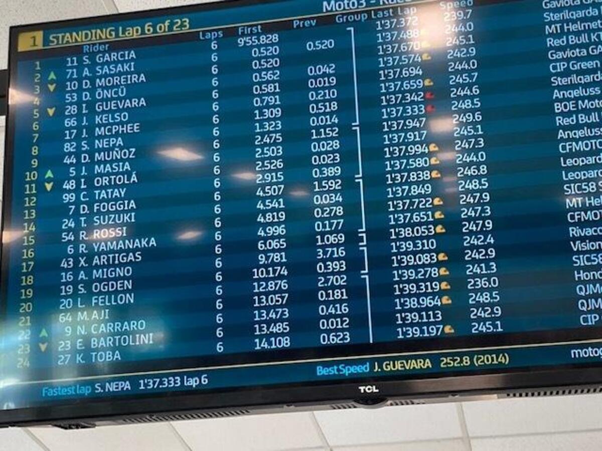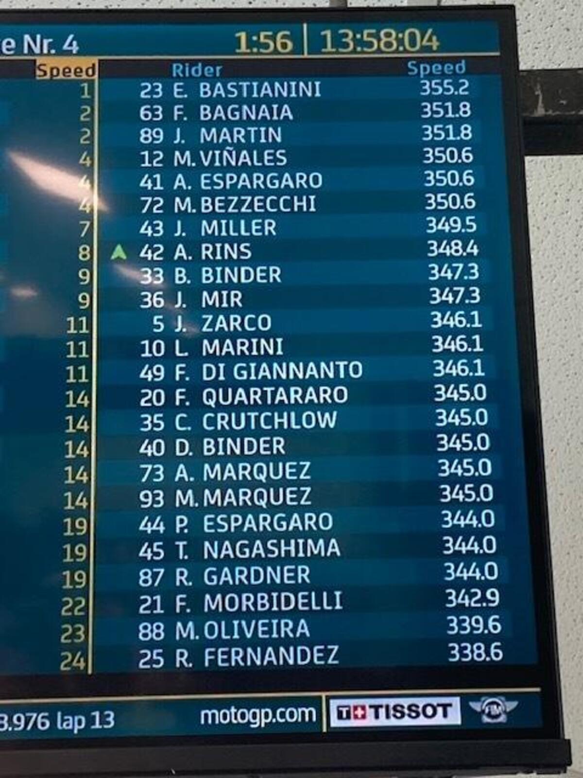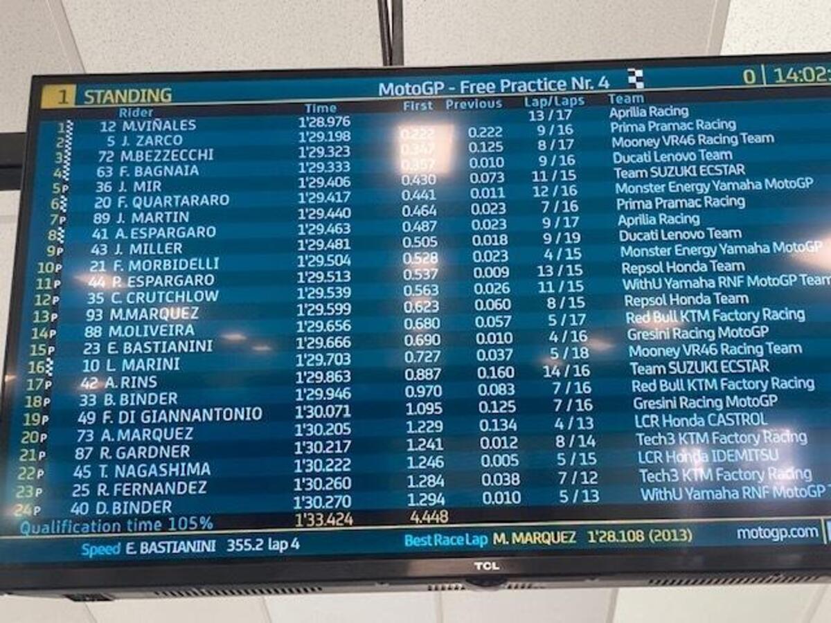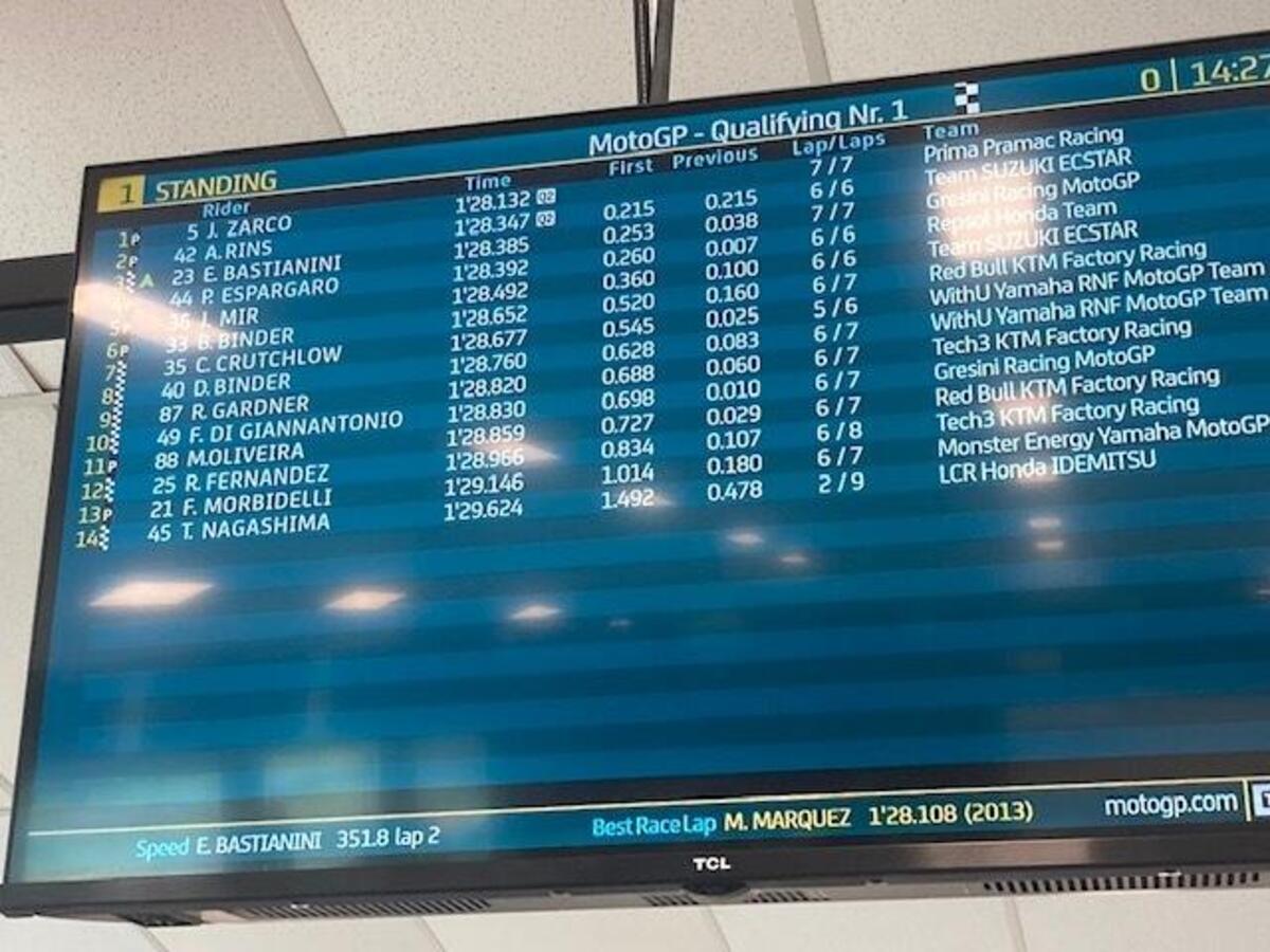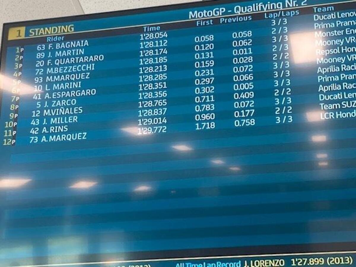 Ecco i dieci al momento in Q2: Zarco, Bezzecchi, P.Espargaro, Quartararo, Vinales, Marquez, A.Espargaro, Bagnaia, Bastianini e Martin=