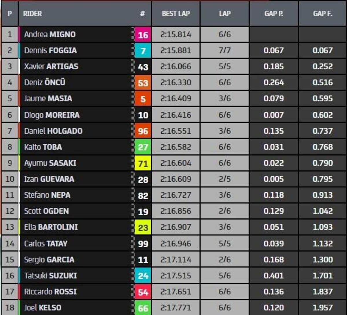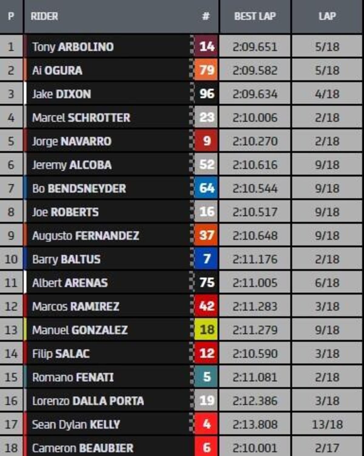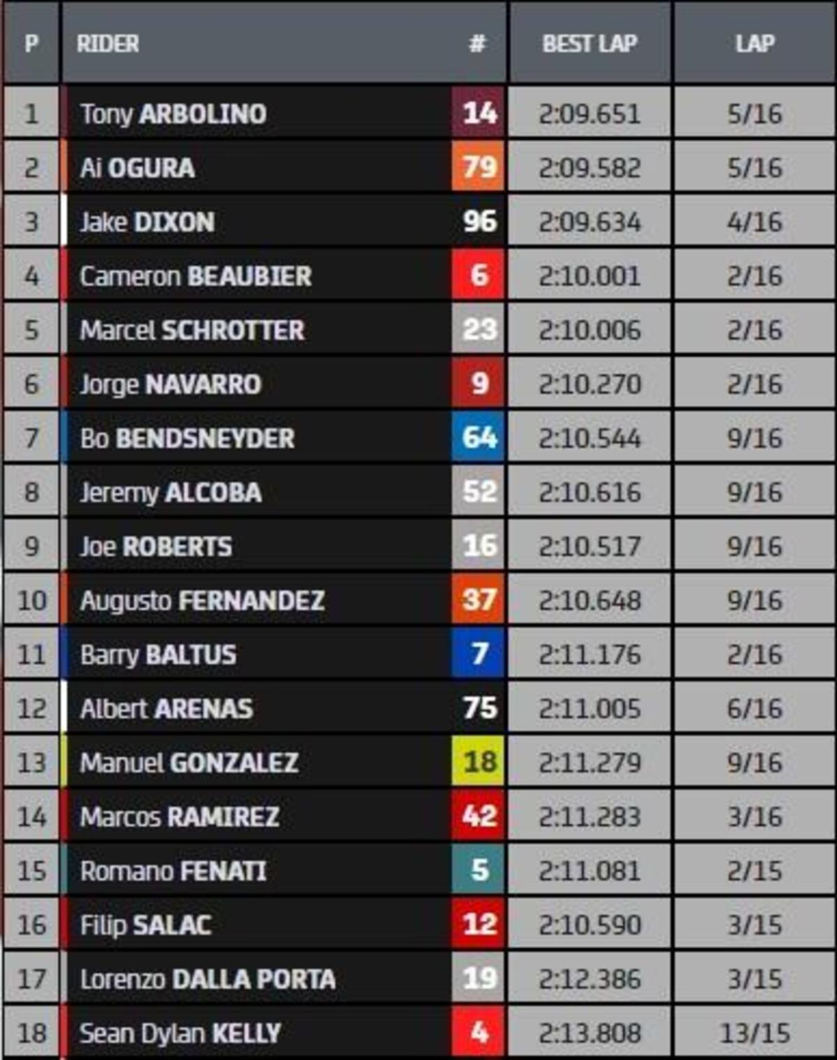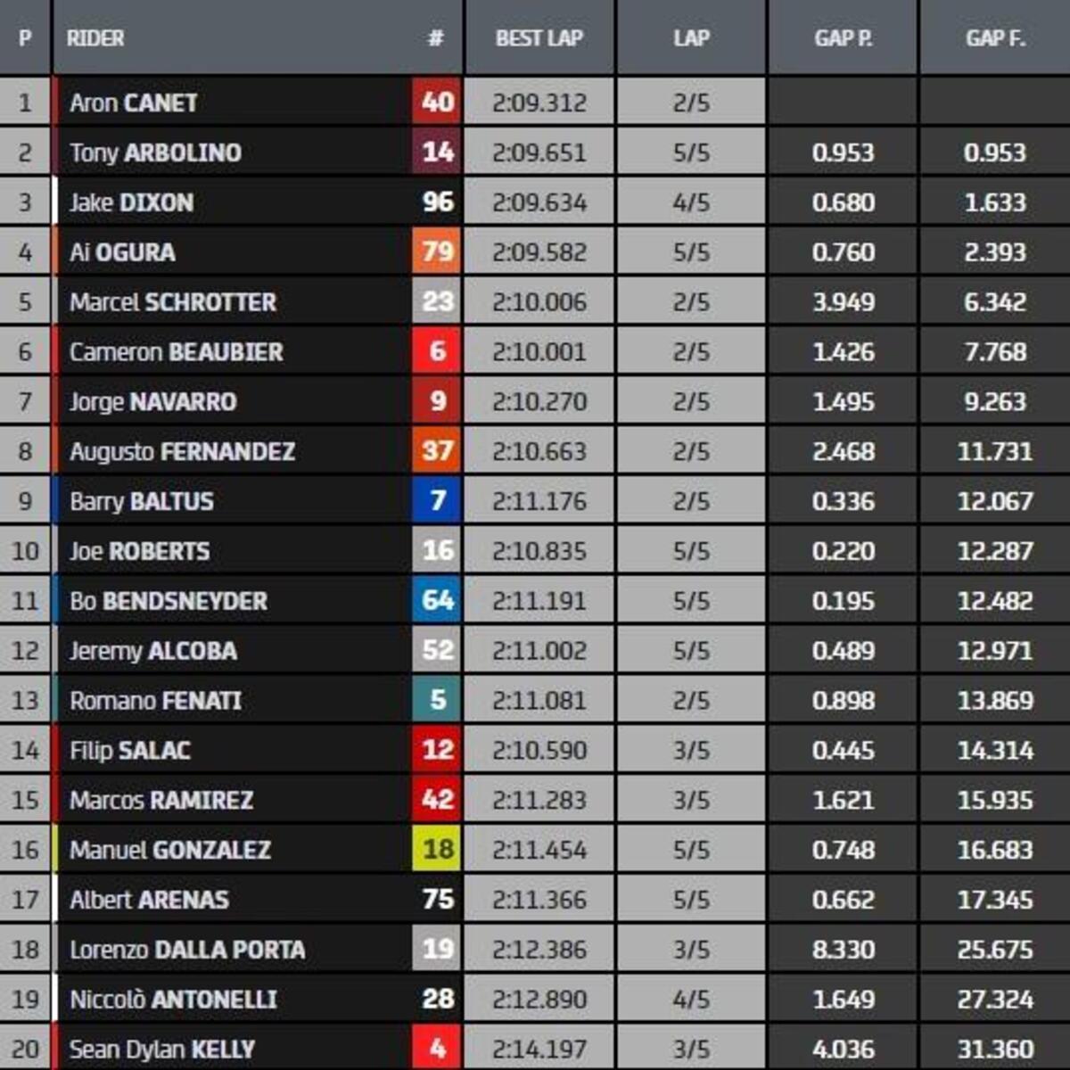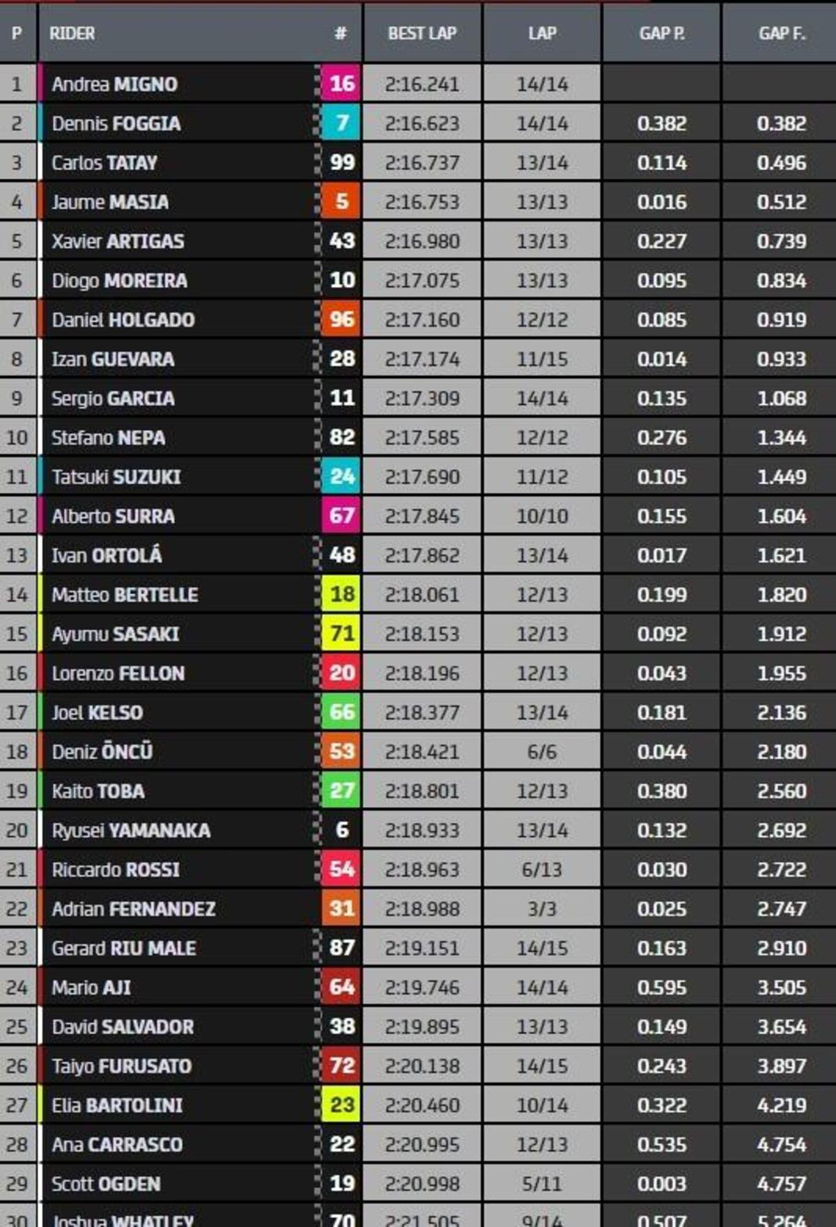 “Soffro un po’ di chattering e quando metti la gomma soffice nuova ovviamente aumenta e diventa difficile guidare la moto. Oggi non sono stato abbastanza veloce, domani dobbiamo migliorare. Rispetto all’anno scorso qui ci sono tante differenze: moto, dentro al box, asfalto. Insomma, quest’anno è molto meglio, ho potuto girare con un passo più veloce dell’anno scorso senza fare errori. Questa pista, però, non si adatta così bene al mio stile di guida, faccio fatica a fermare bene la moto alla prima curva, io qui non sono così efficace come in altri tracciati. Credo che se domenica sarà possibile lottare per i primi sei, sarebbe un segnale molto positivo. Sono molto concentrato per cercare di capire dove e come posso migliorare, anche con Matteo Baiocco, stiamo analizzando tutti i video, i dati, anche quelli di Vinales che qui è sempre molto veloce. Sto facendo il massimo per essere competitivo.