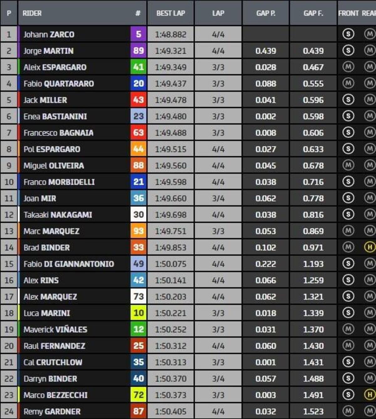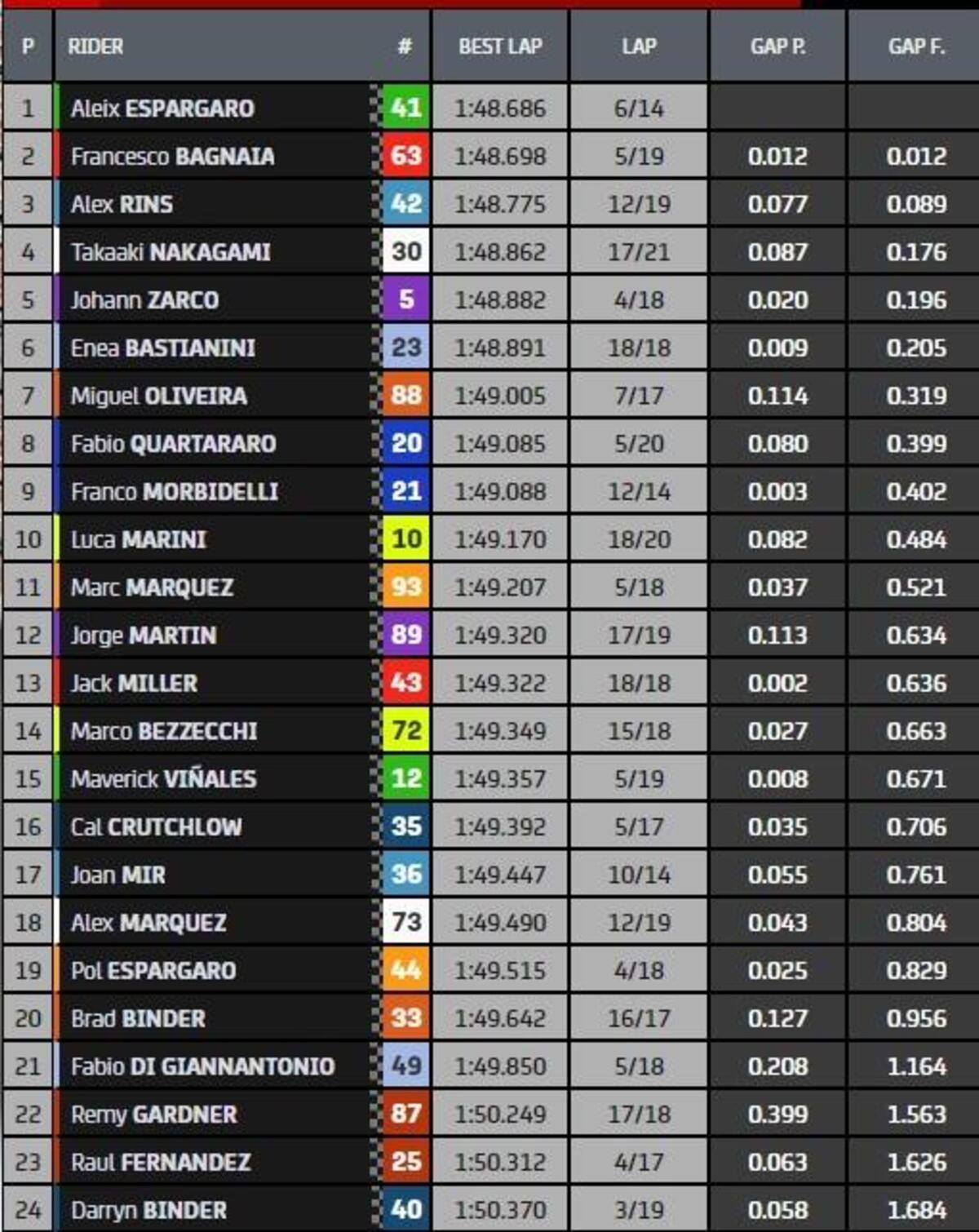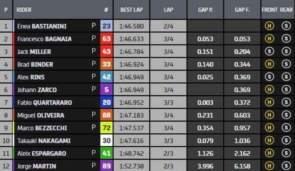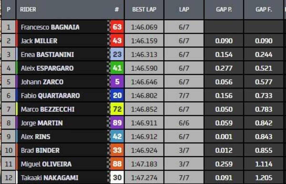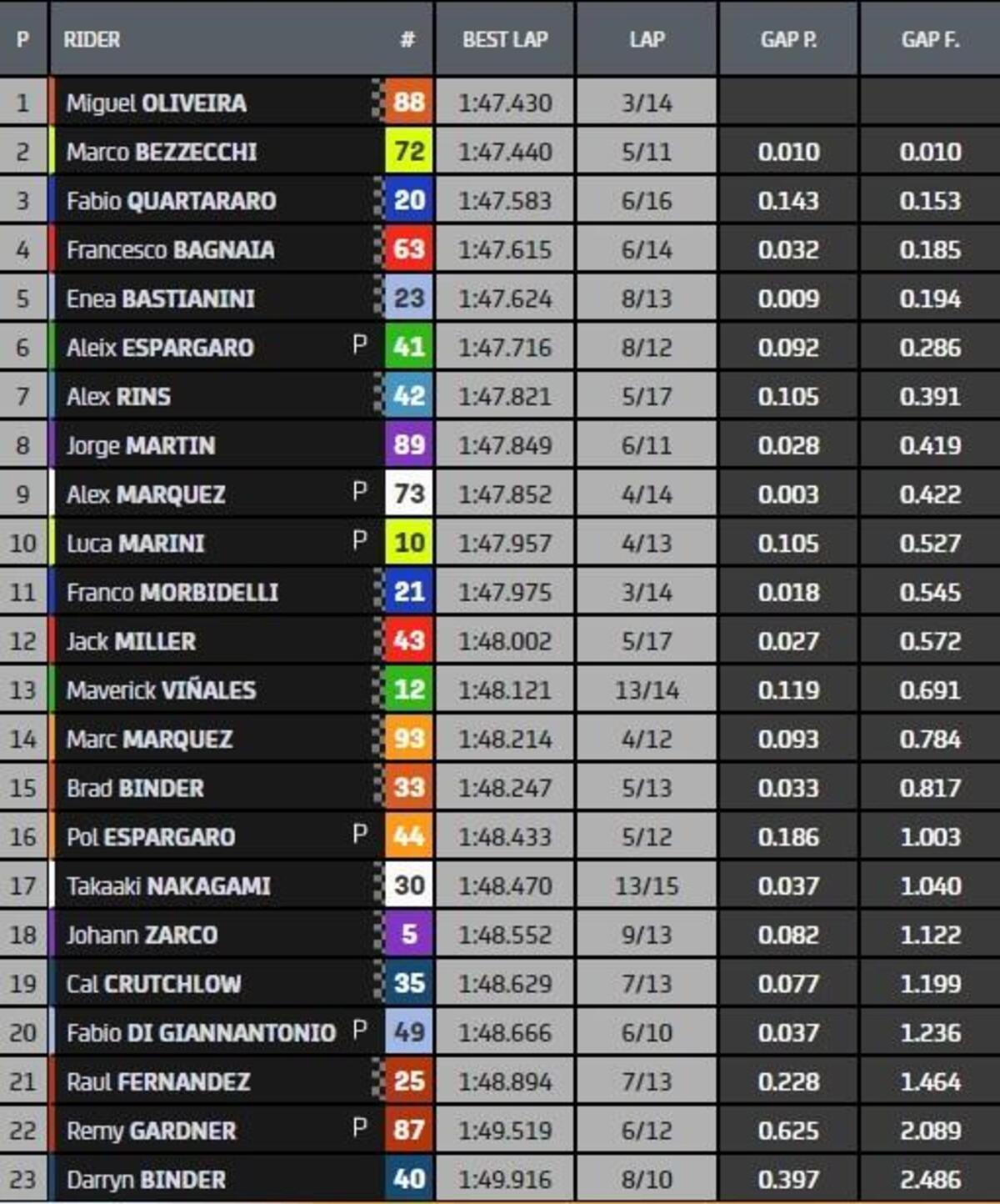 Bagnaia 6, Bastianini 4, Quartararo 3, Aleix 1 e Oliveira 1 (10 Ducati,