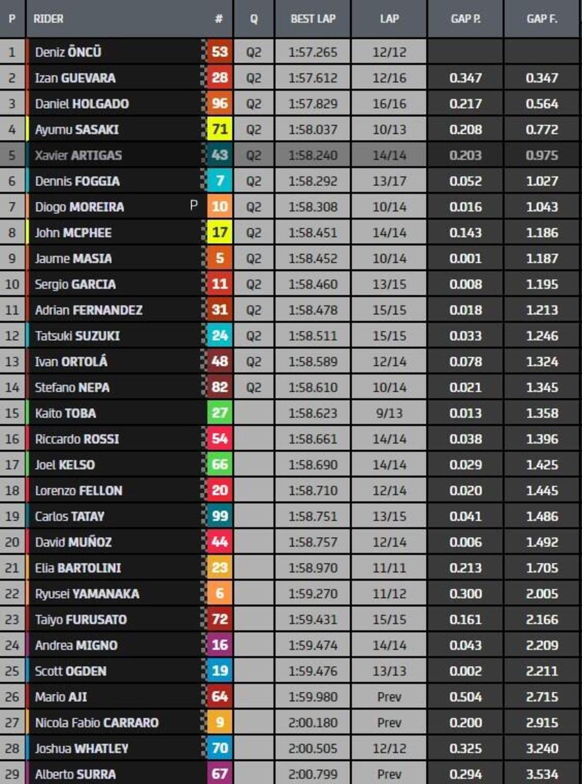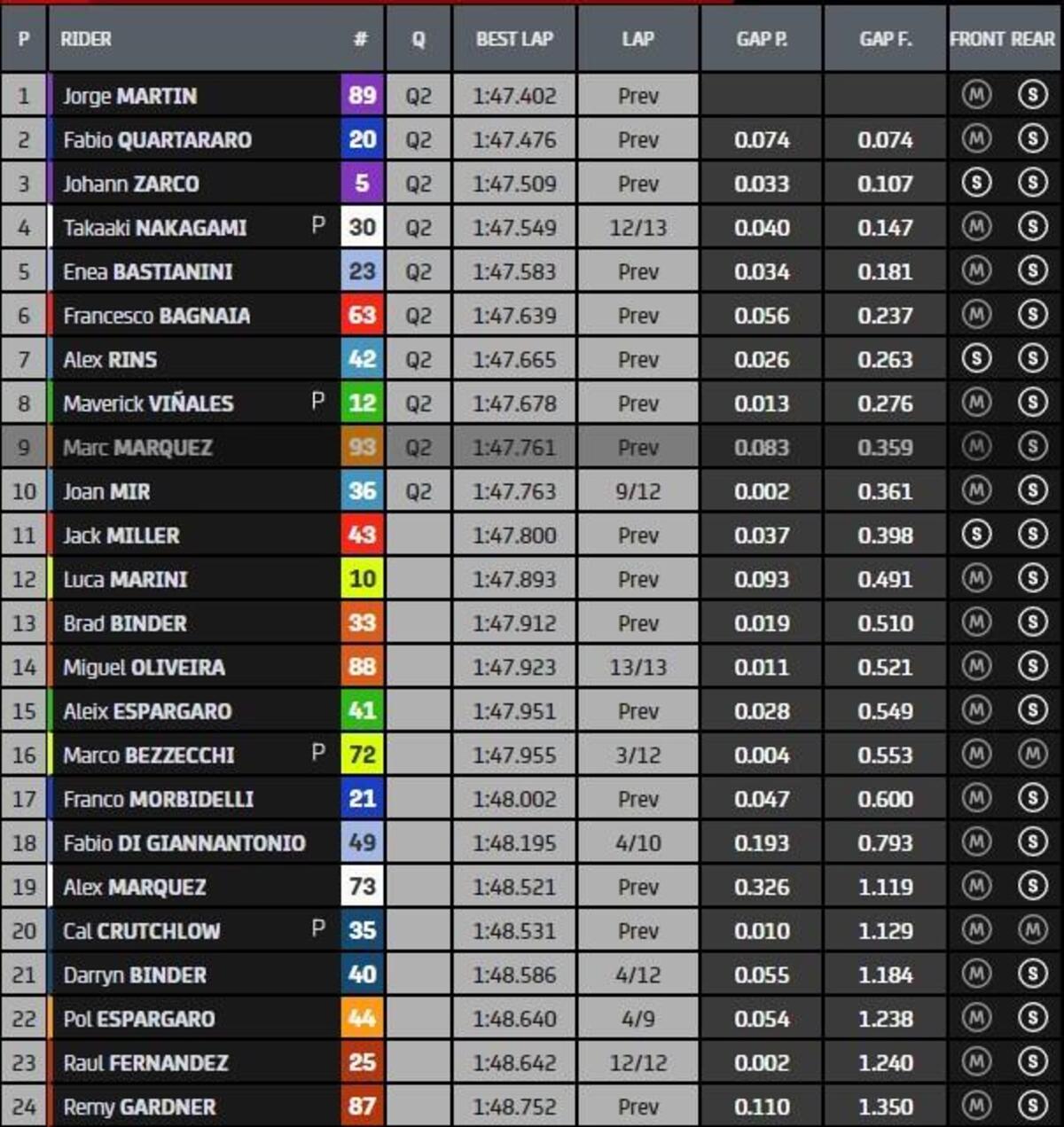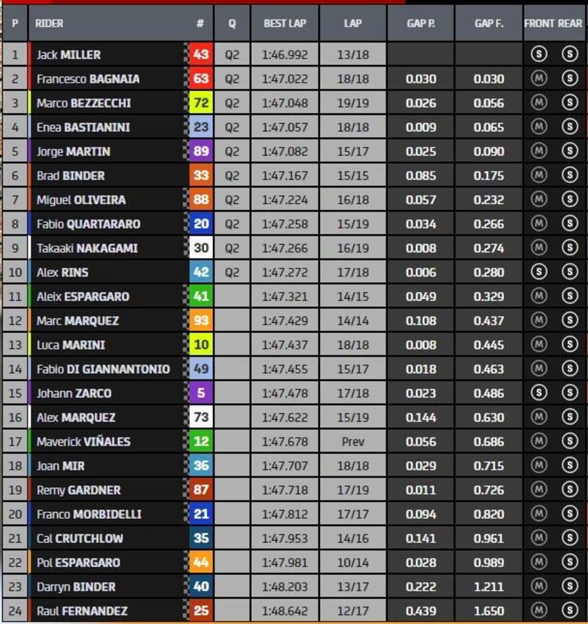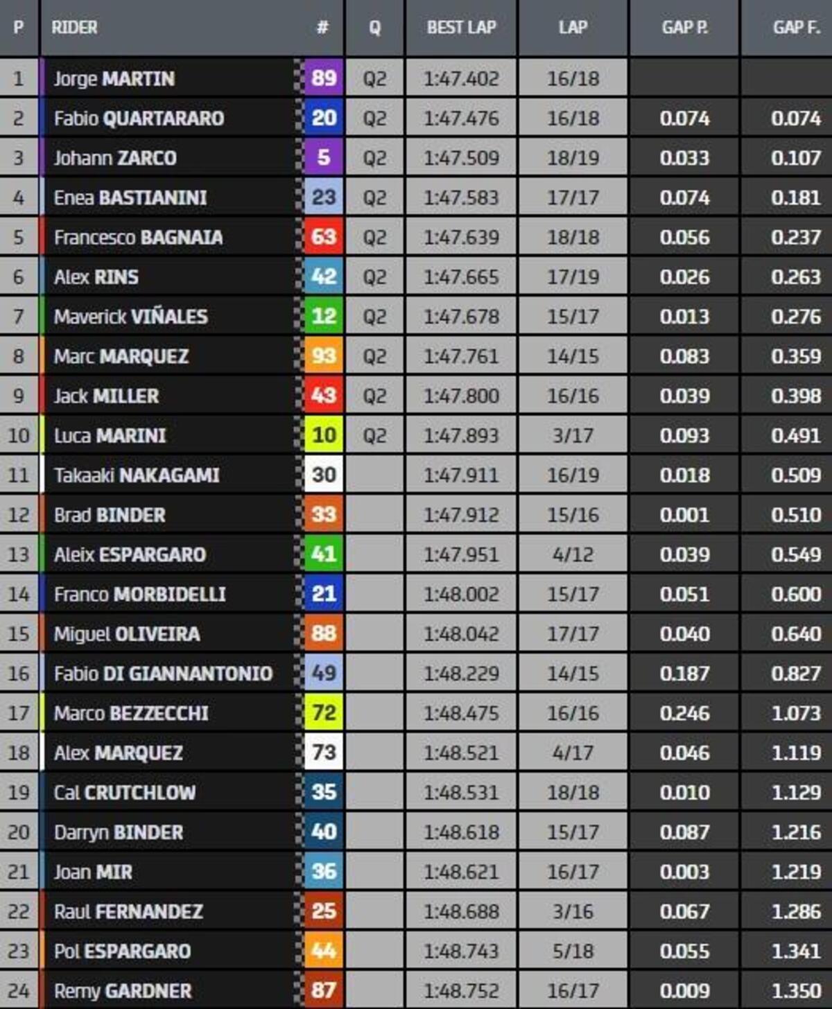 Bagnaia 6, Bastianini 4, Quartararo 3, Aleix 1 e Oliveira 1 (10 Ducati,
