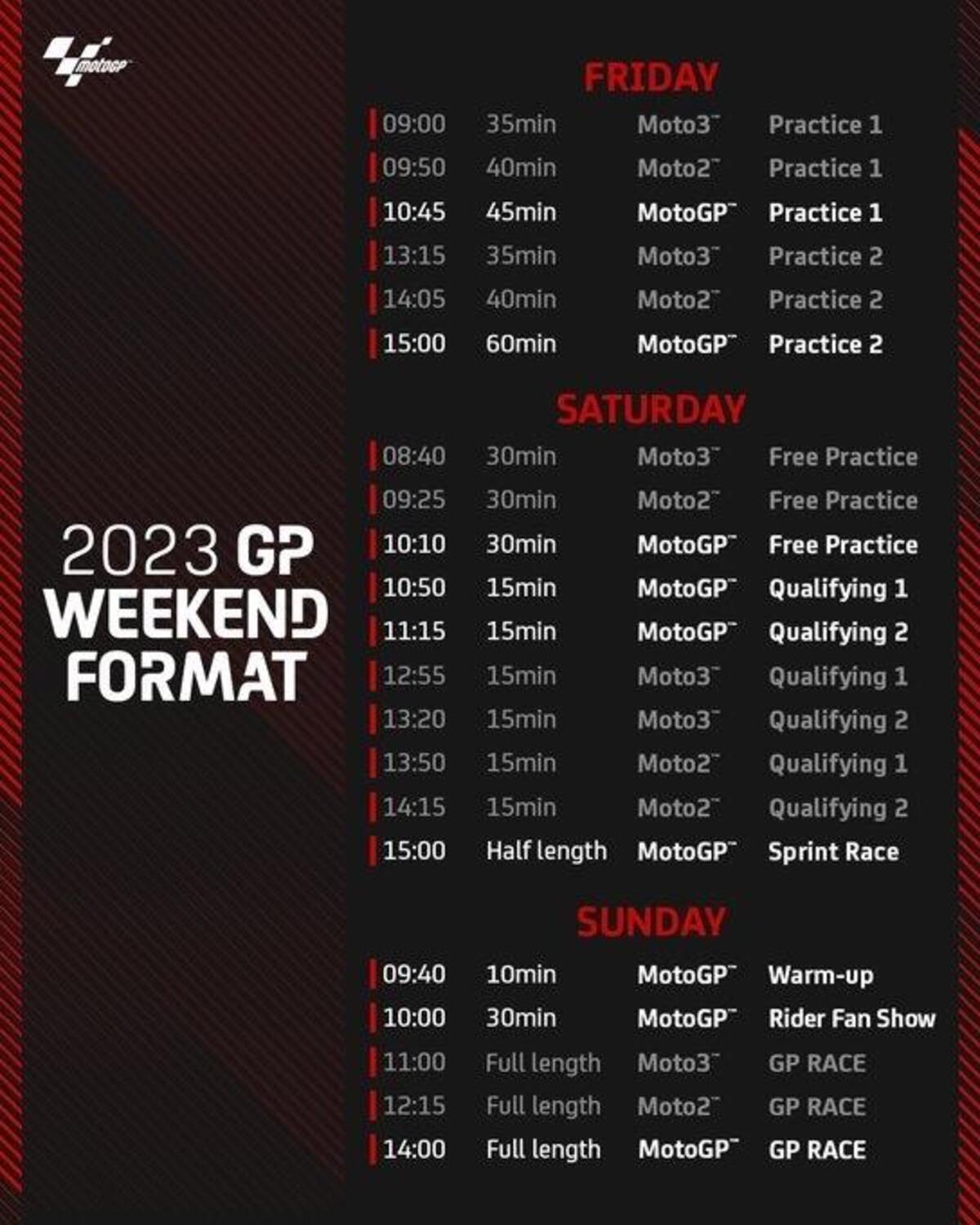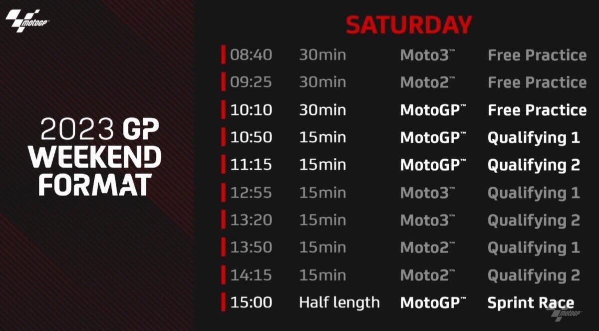 E’ in corso un importante incontro MSMA, Irta, Dorna per definire il programma del venerdì e del sabato della prossima stagione. L’idea è quella di fare FP1 e FP2 il venerdì un po’ più lunghe: questi due turni determineranno l’accesso diretto in Q2. Sabato mattina: FP3 e a seguire Q1 e Q2, quindi la gara sprint alle 15. Vediamo se cambia qualcosa.