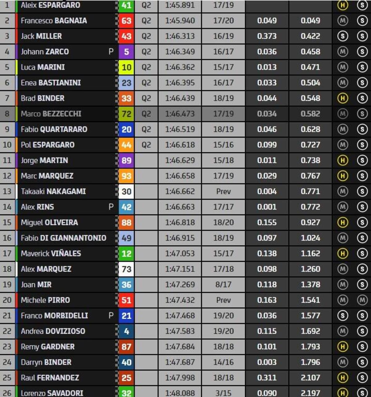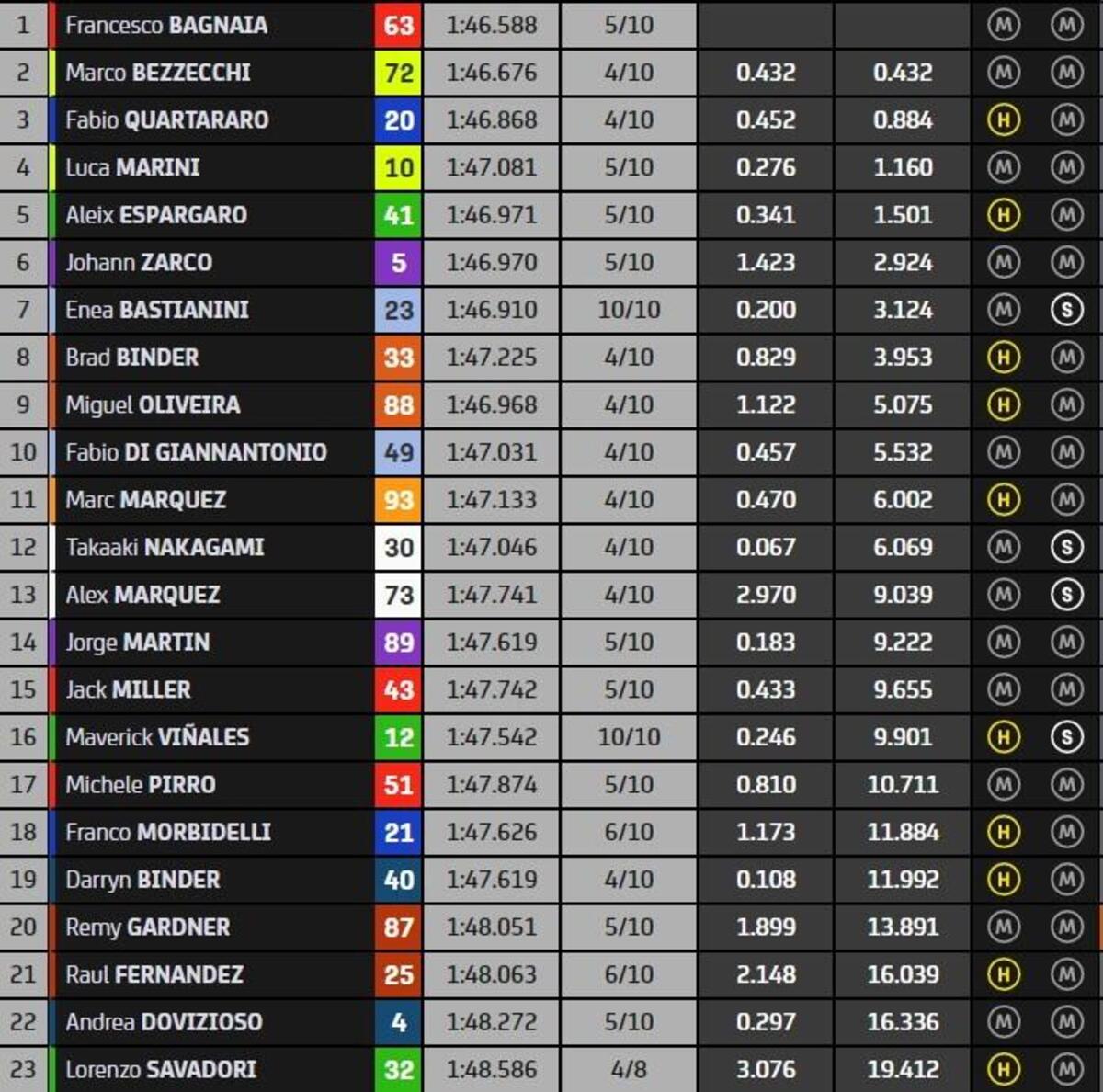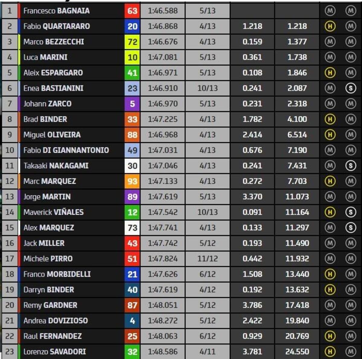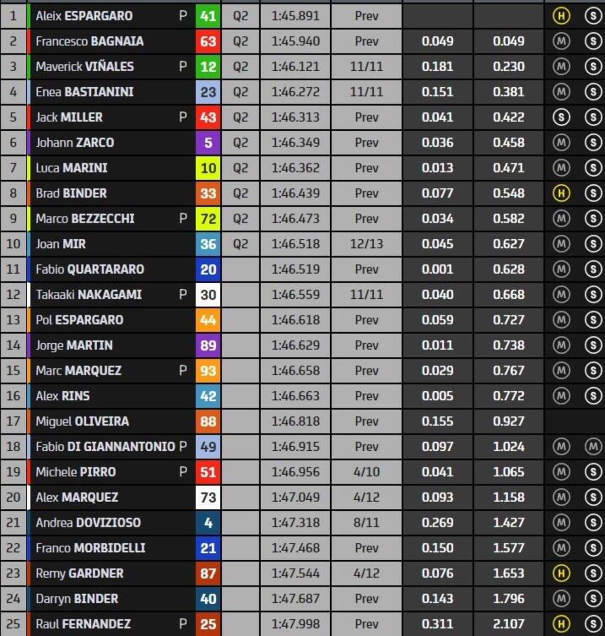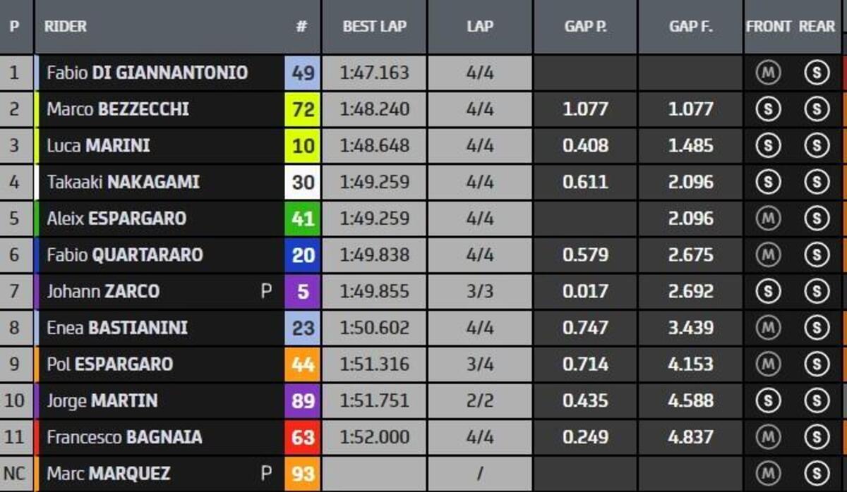 bagnaia ha 1.2 su fabio che ha 0.7 sulla coppia bezz-aleix
