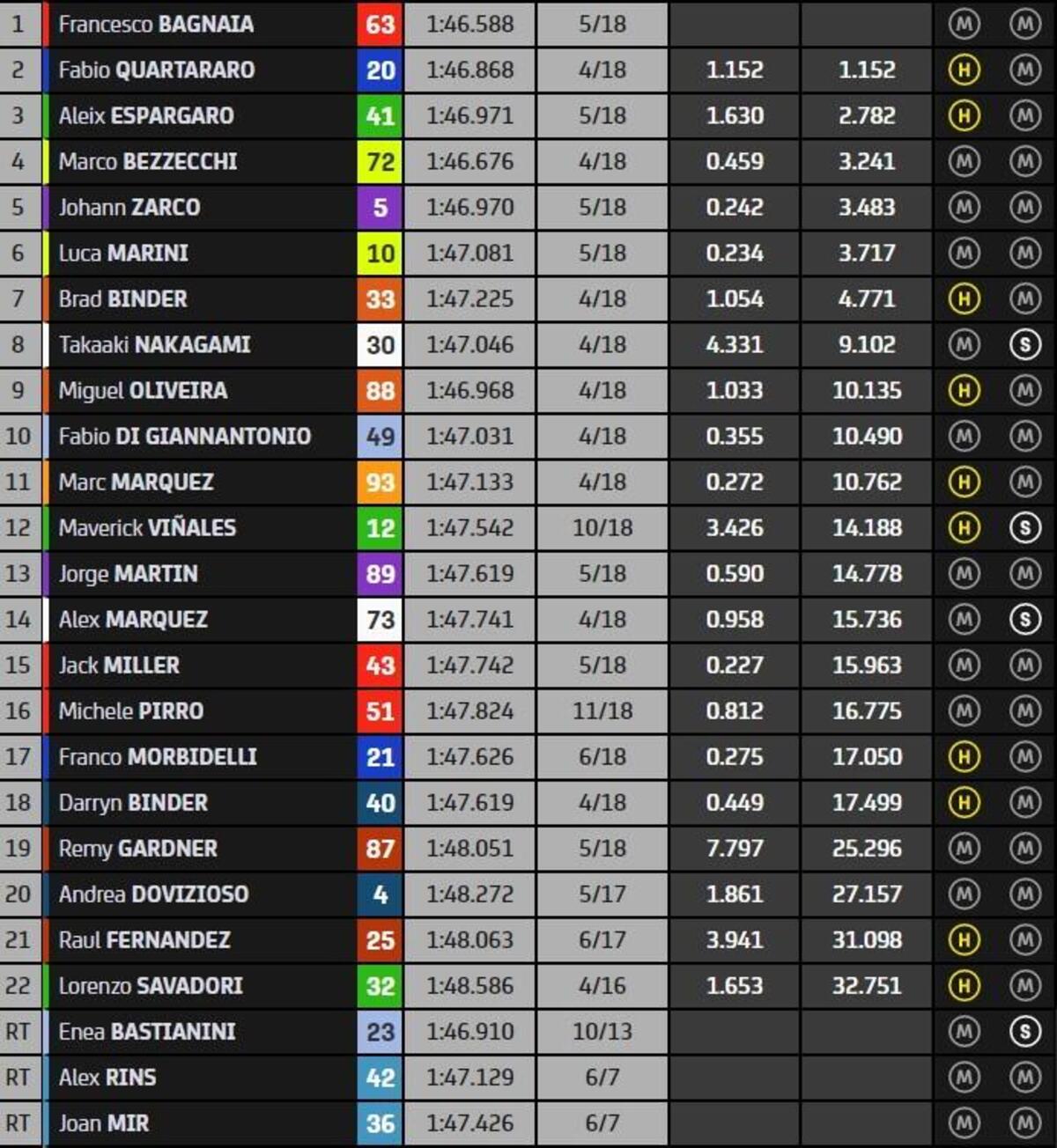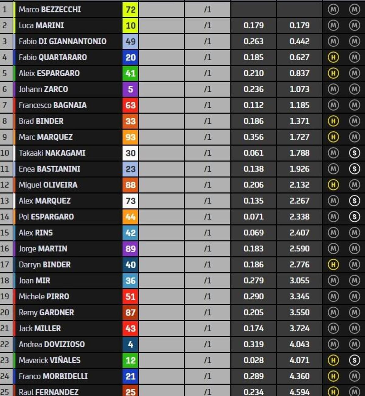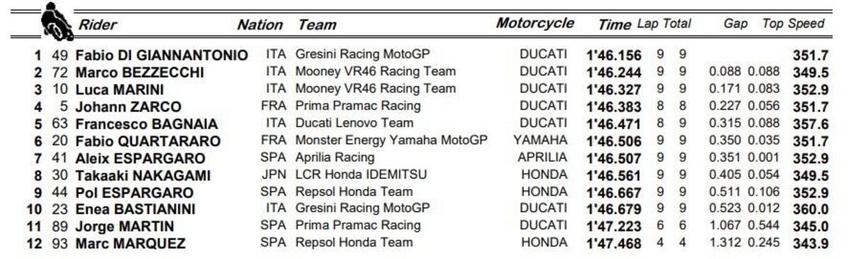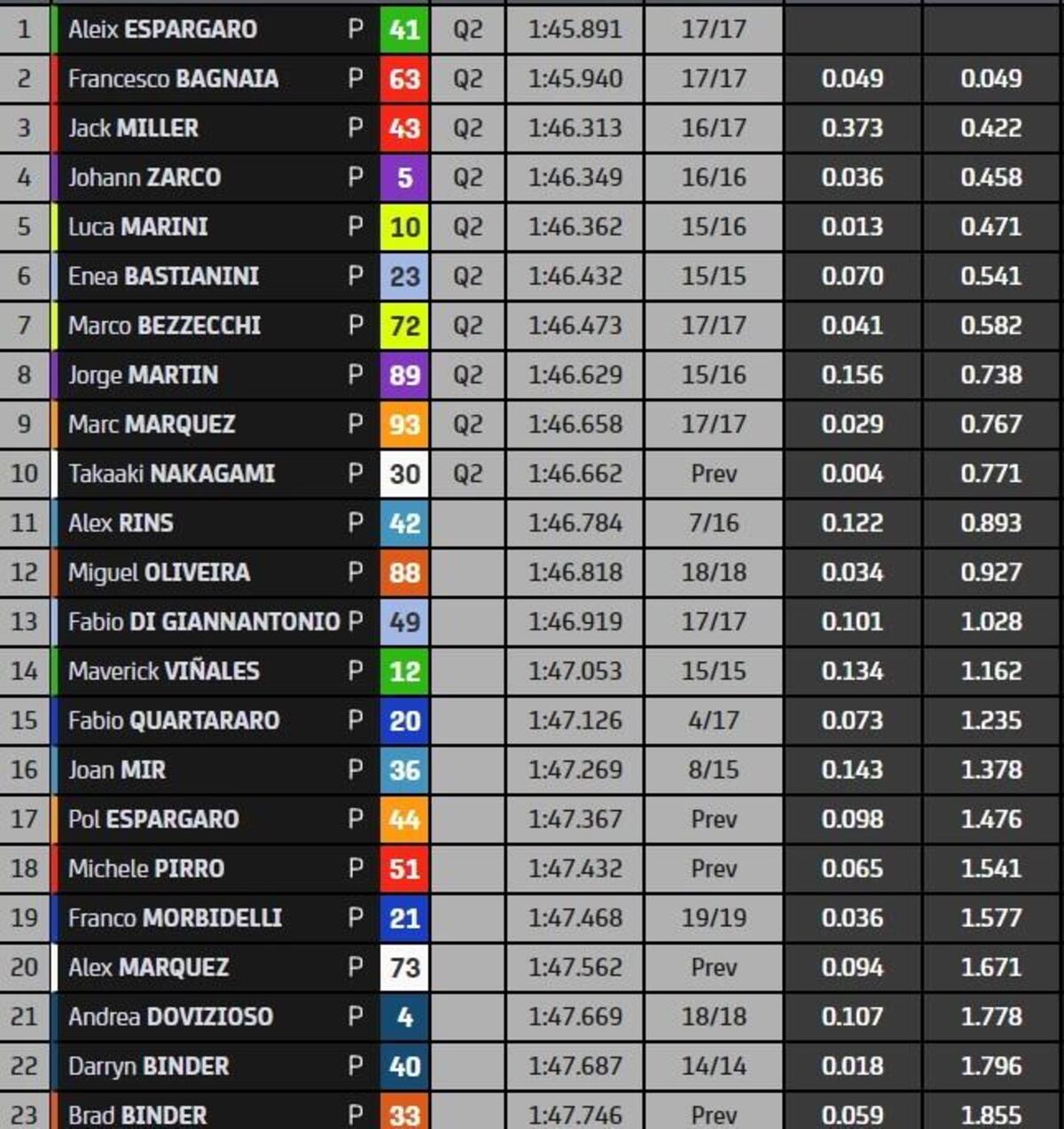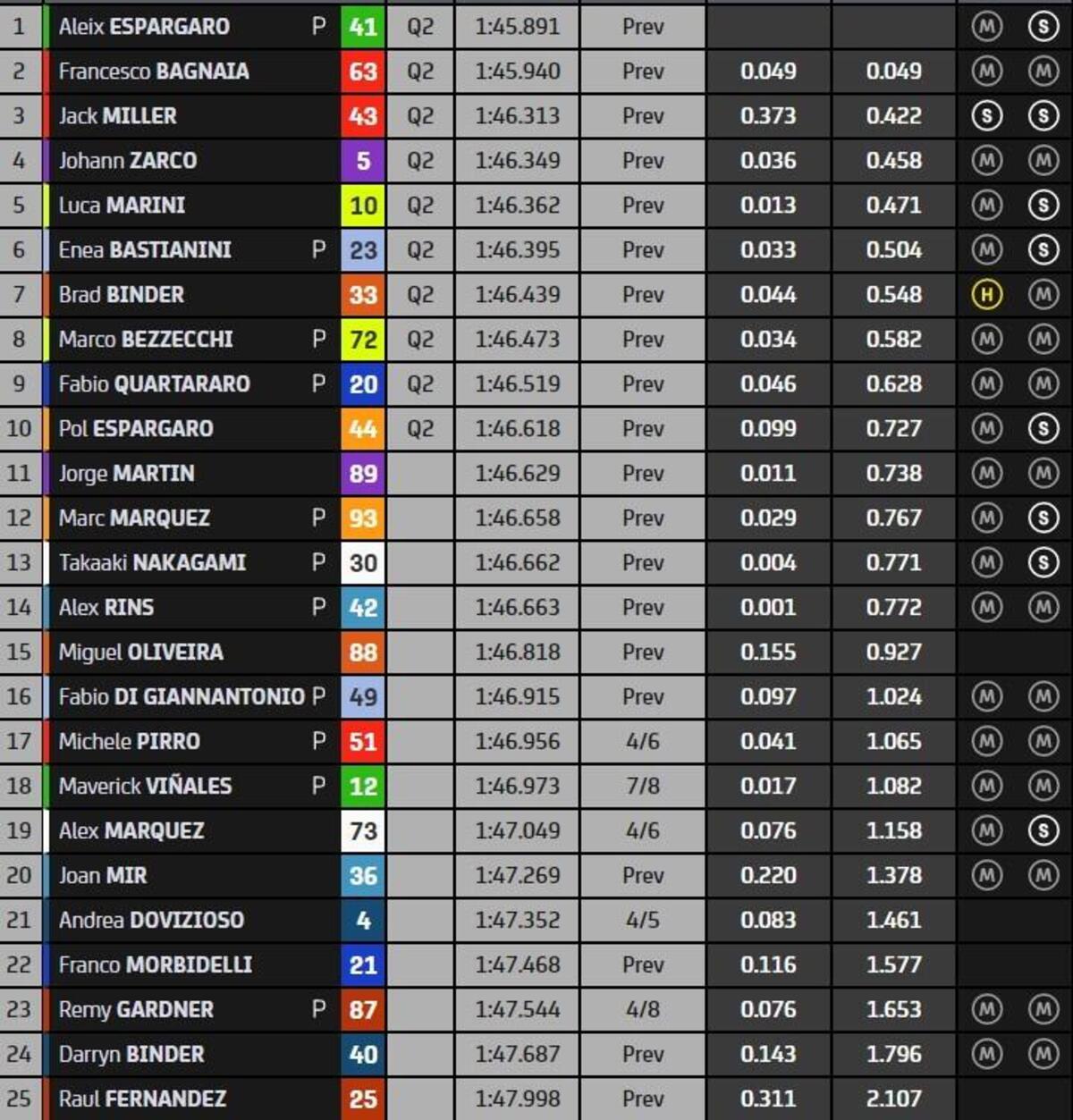 bagnaia ha 1.2 su fabio che ha 0.7 sulla coppia bezz-aleix